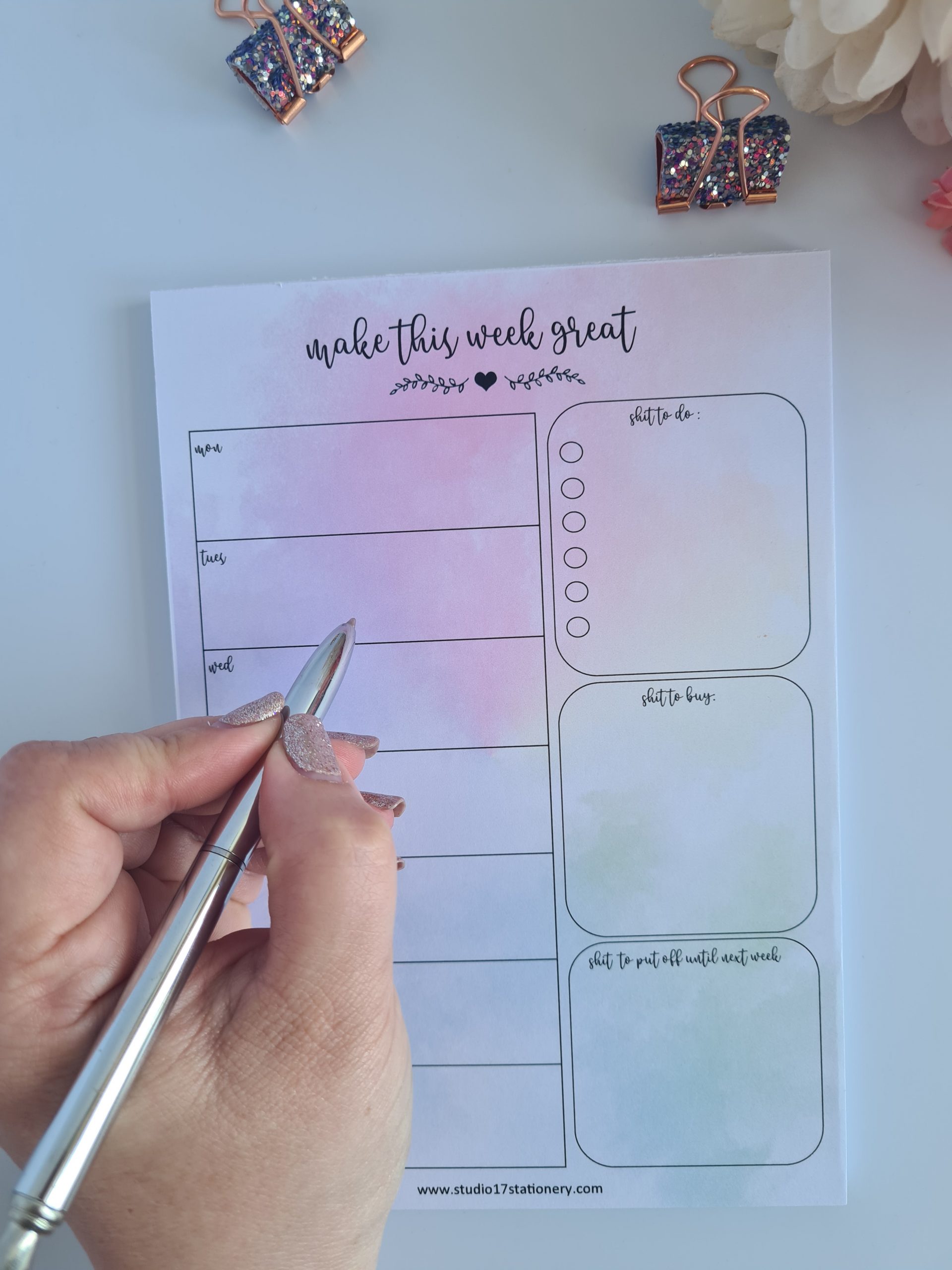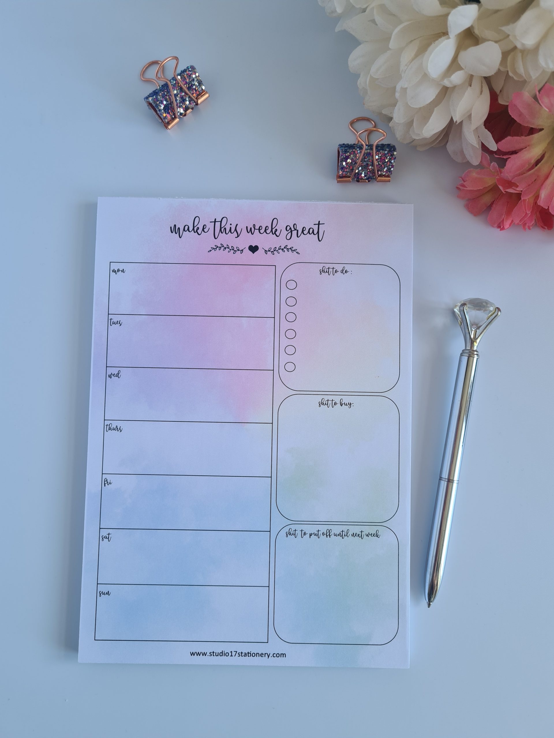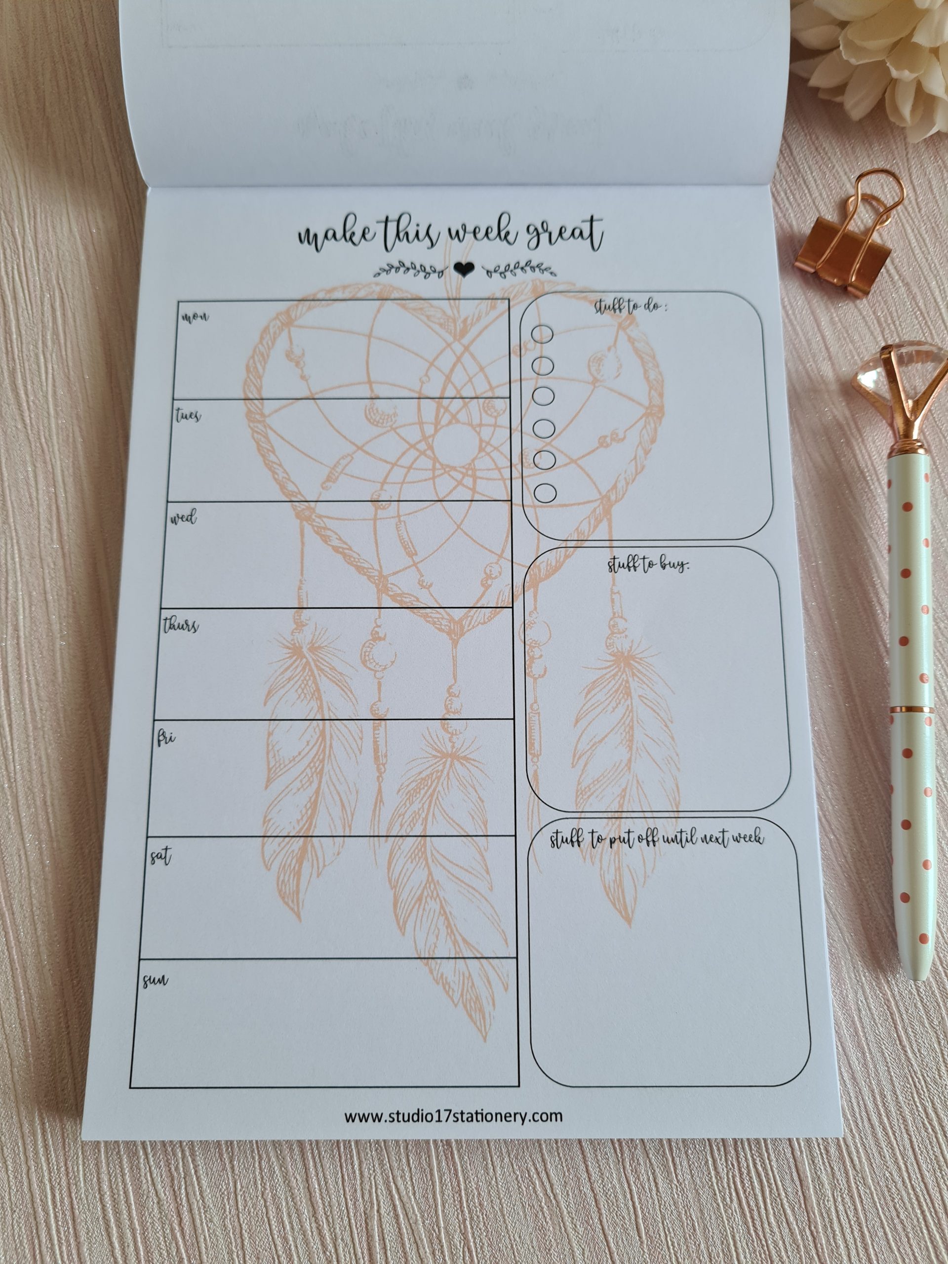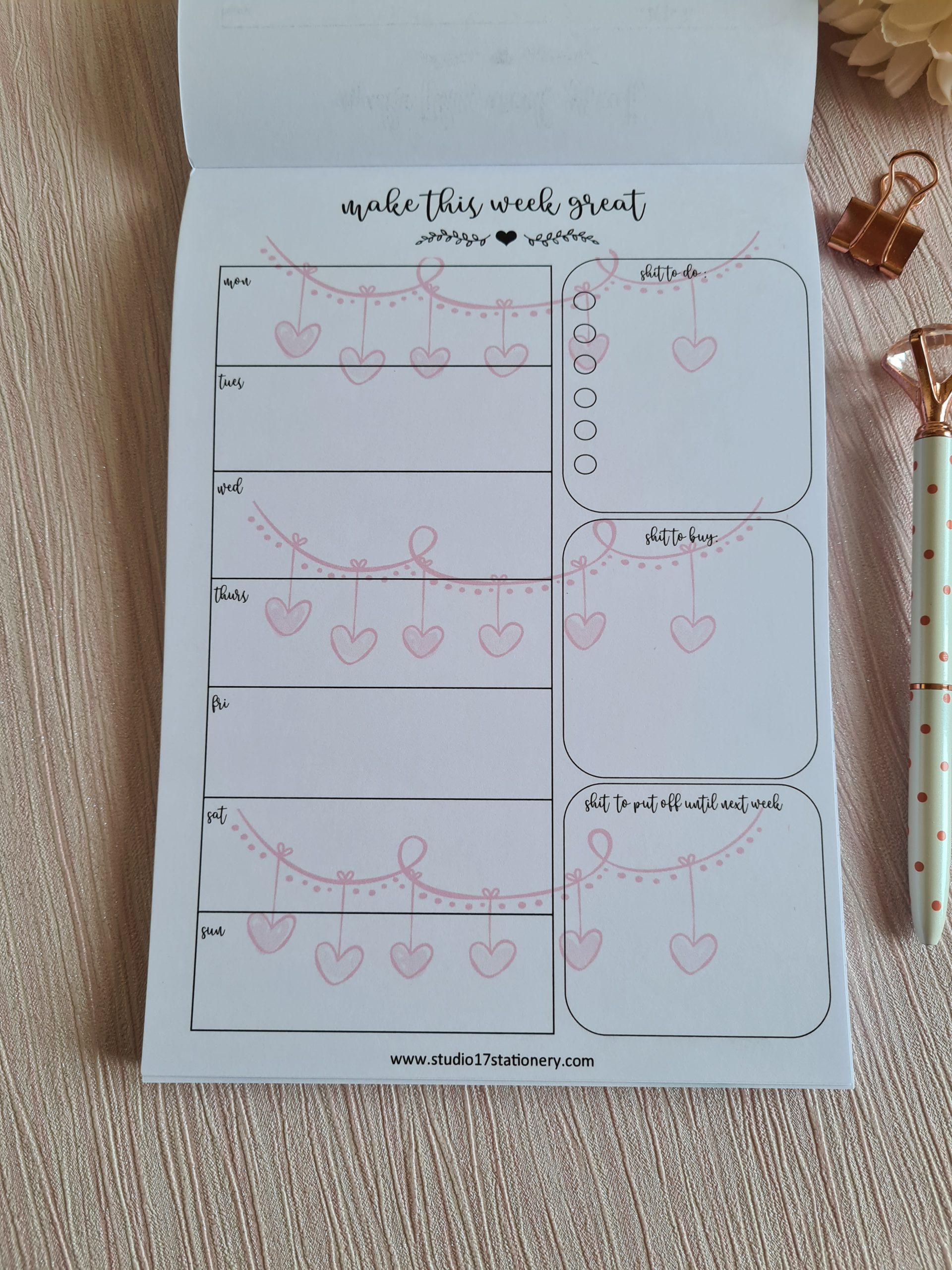 Each planner comes with 52 tear off pages . 4 designs available – plain, dreamcatcher, rainbow and hearts. 2 variations on page layout- a nice polite version with ‘stuff to do’ and a common version with ‘shit to do’ !!