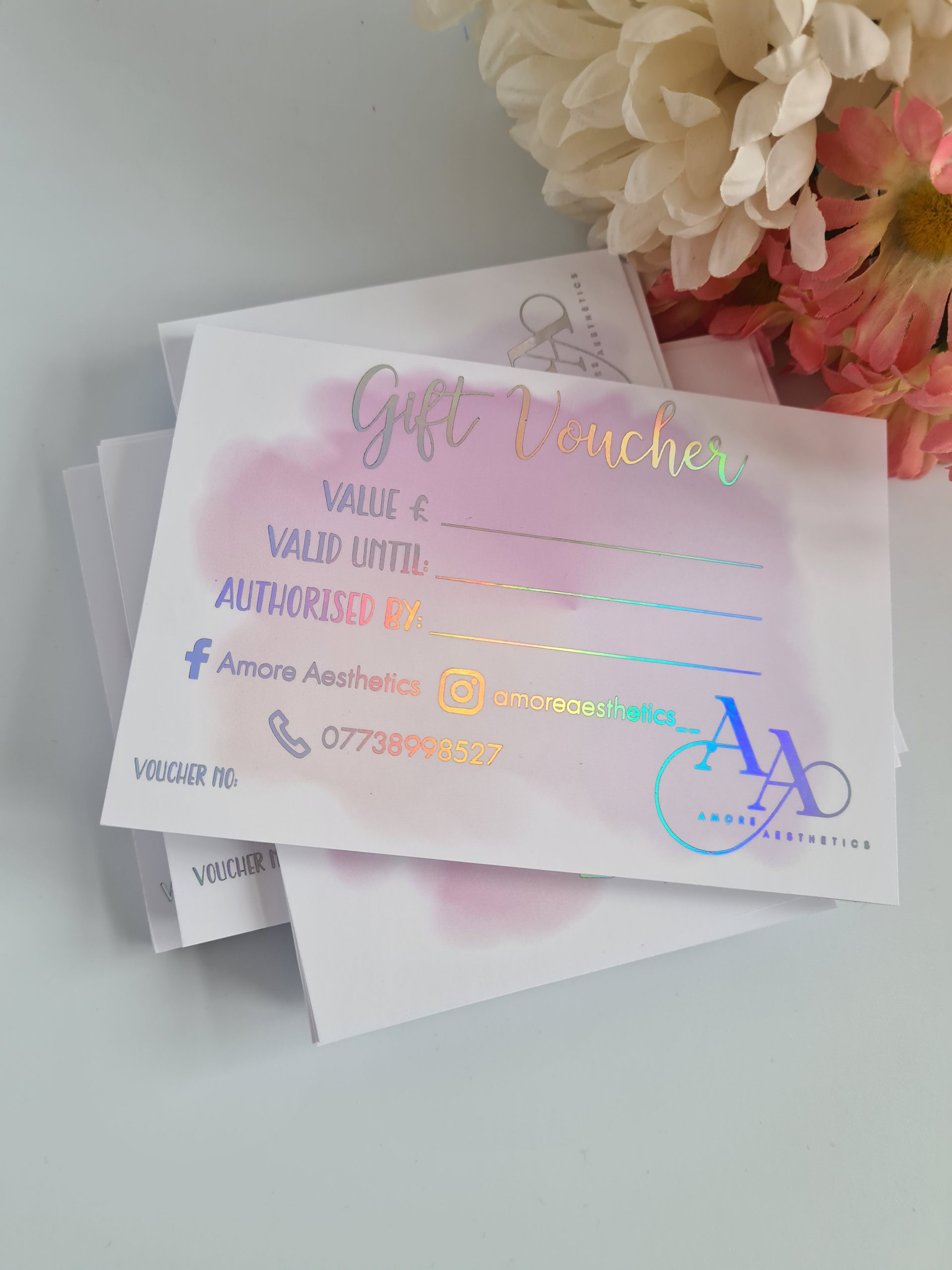 Foiled Gift Voucher cards in approx A6 size (may come up slightly smaller once trimmed) Pack of 50 cards Available in Gloss or Matt finishes -single sided printing