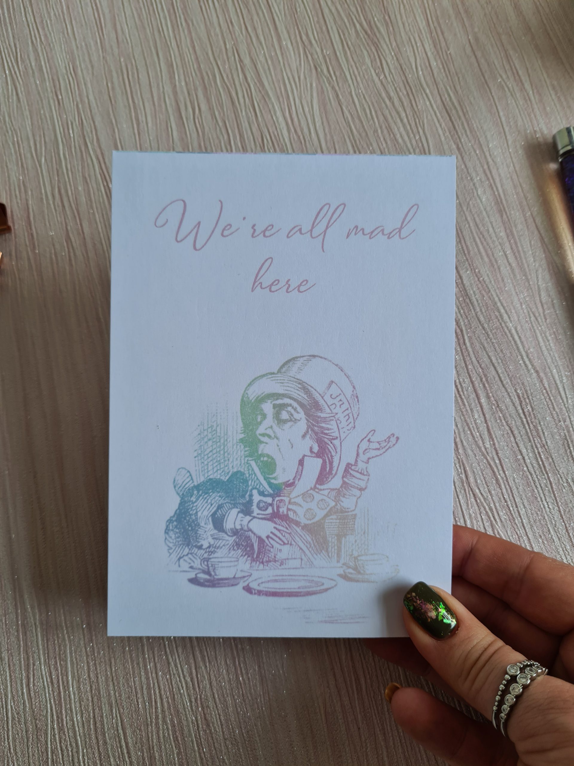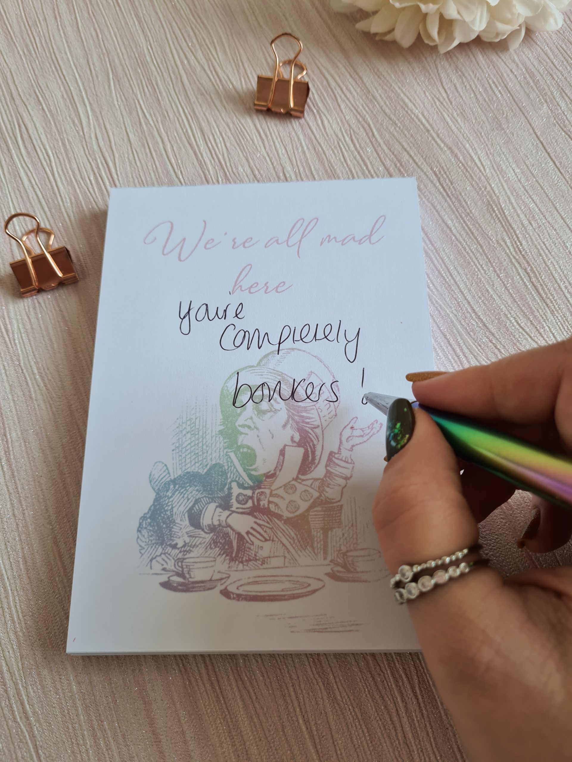 Mad Hatter theme for this notepad with 50 tear off pages of 100gsm paper, a stirdy greyboard backing and gummed top edge.