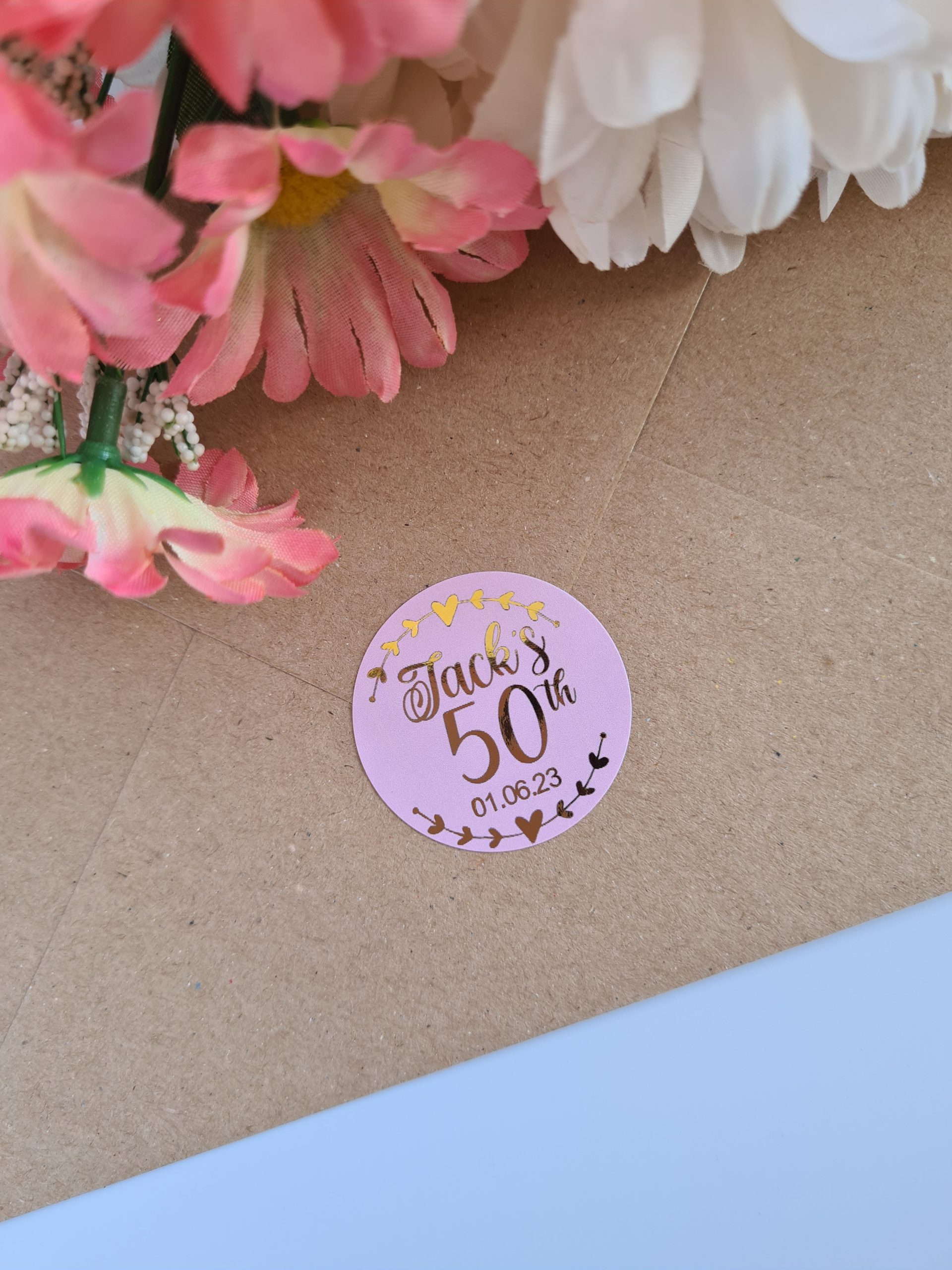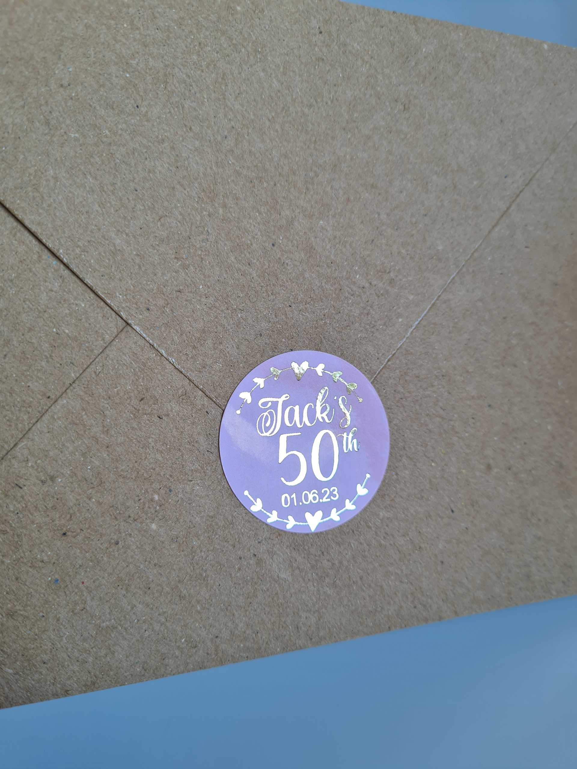 Foiled foiled stickers 37 mm. Available in White/Clear and Coloured Gloss or Frosted finish. Available in mulitples of 35.