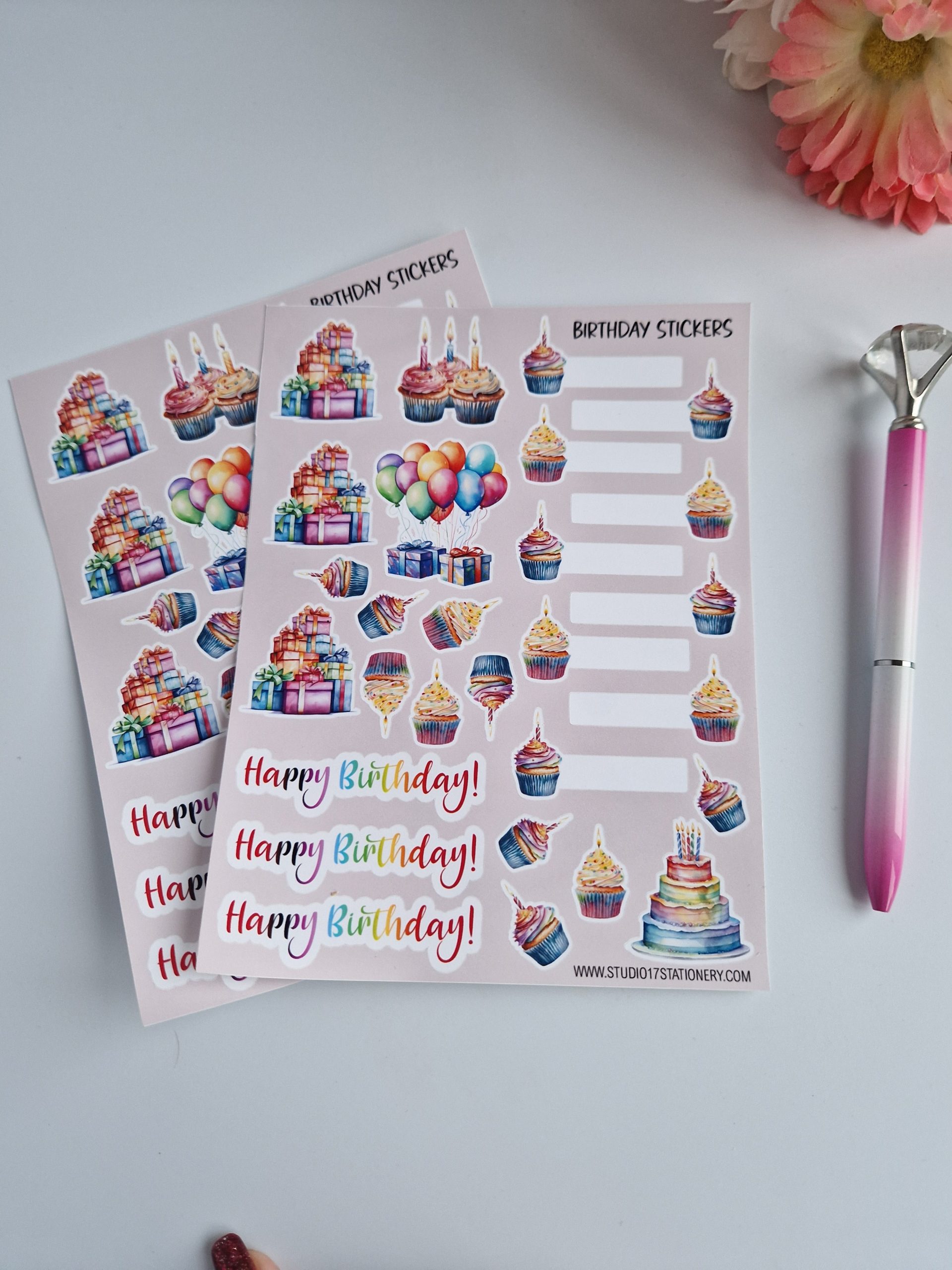 Sheet of kiss cut planner stickers with a birthday/celebration design. This sheet contains a total of 28 stickers.