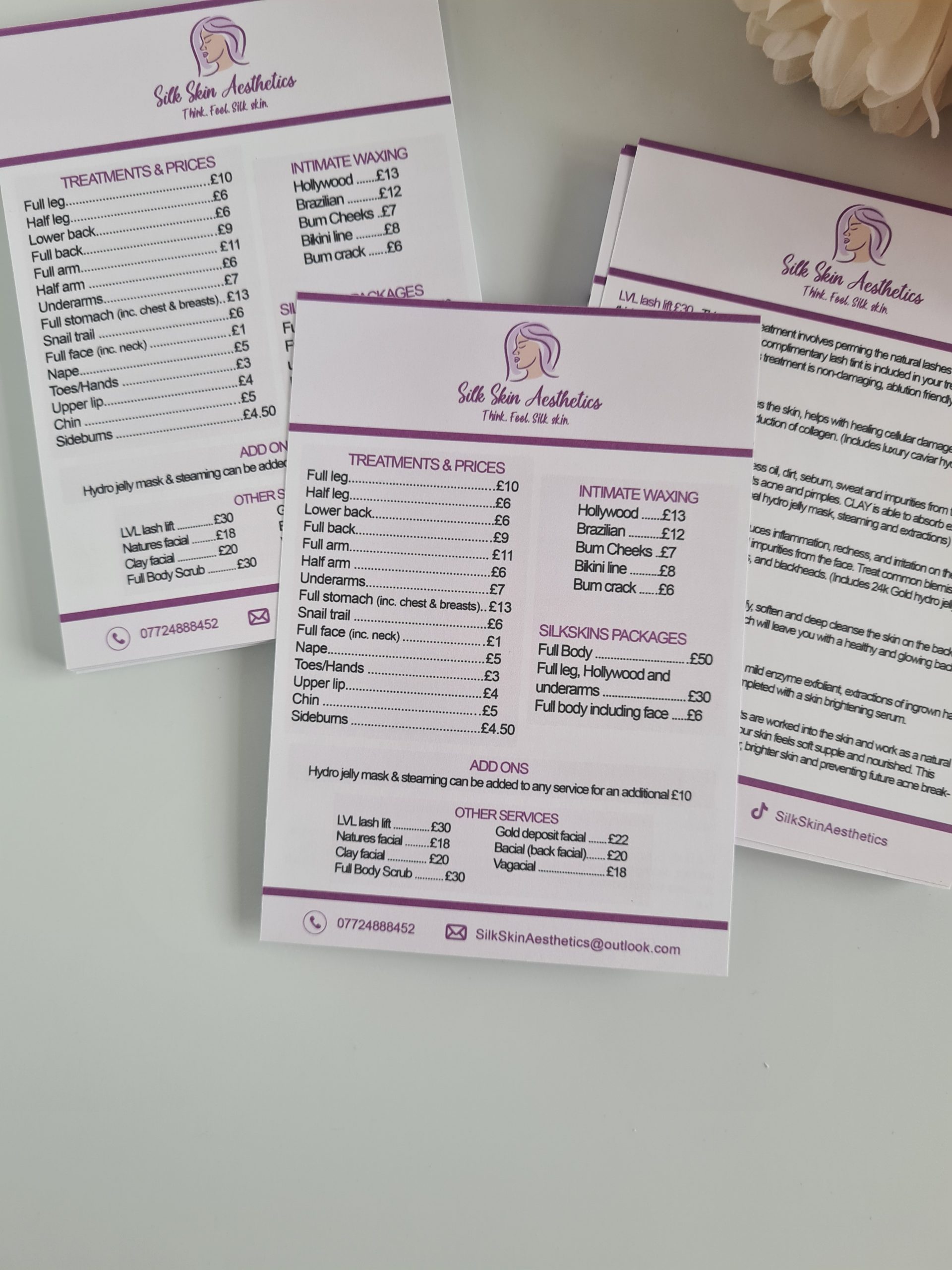 Business Flyers in super smooth 160gsm paper. Available in A5 or A6 sizes and also in single sided and double sided options. Content set by you – can be pricelists, photo flyers, event advertising etc.