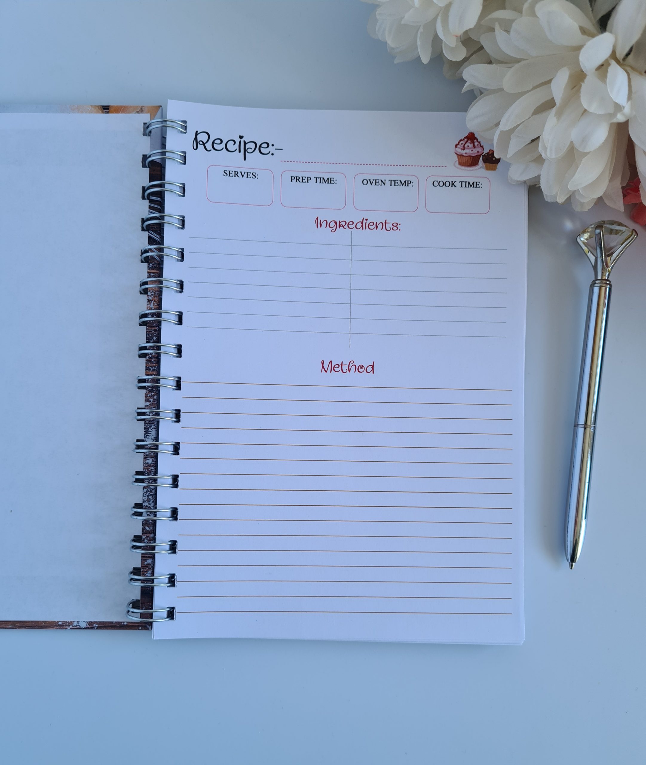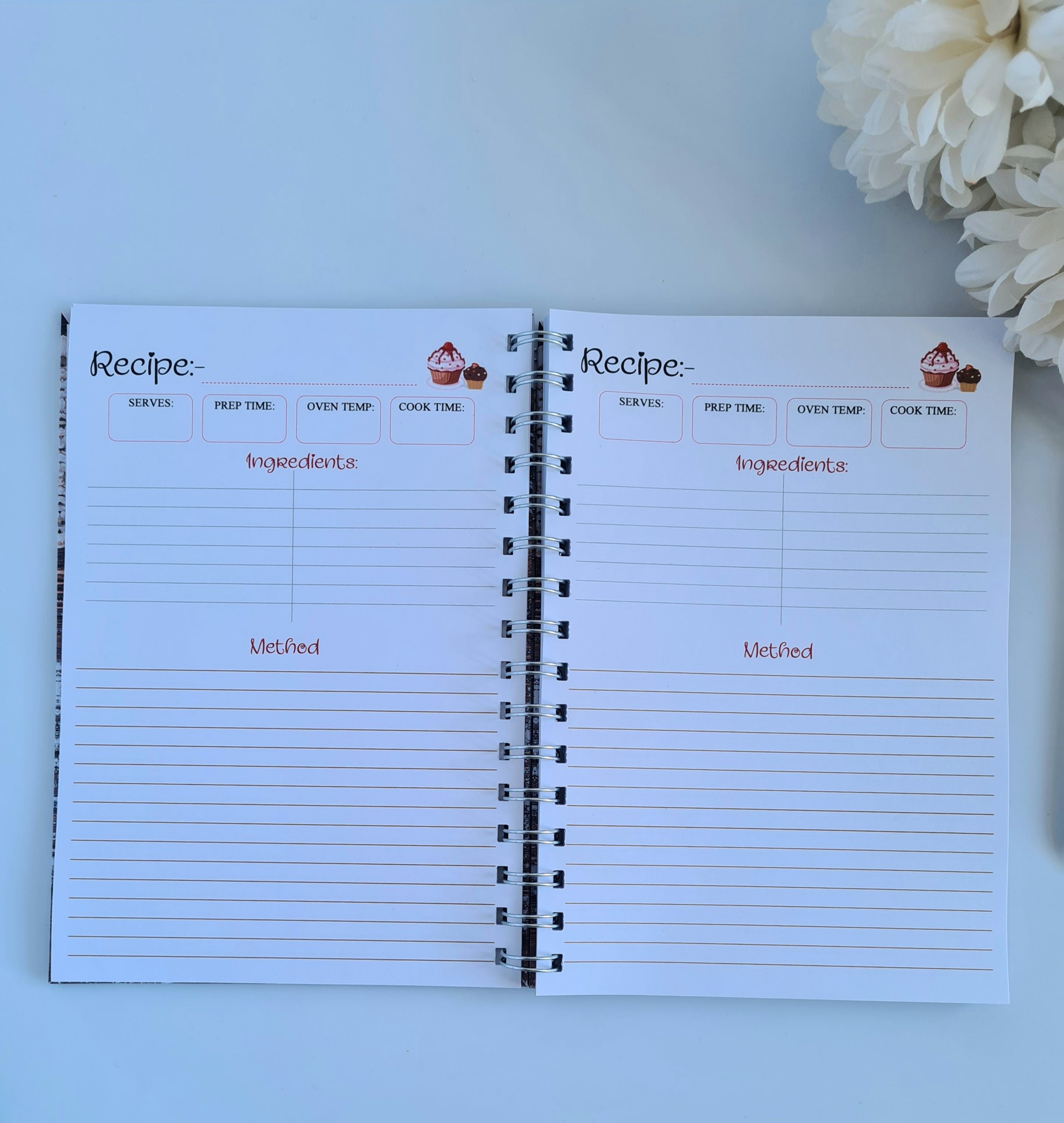 Can contain lined recipe book pages with space for ingredients, method and cooking time, or it can contain lined pages. A5 book with 60 double sided pages. Hardback covers with Matt Vinyl finish. Additional laminate protection can be added to help protecct the cover from splashes.