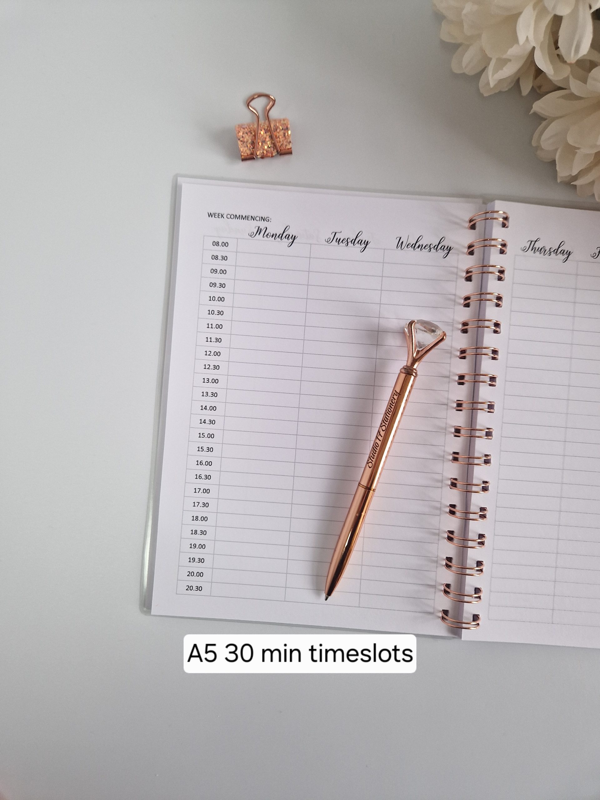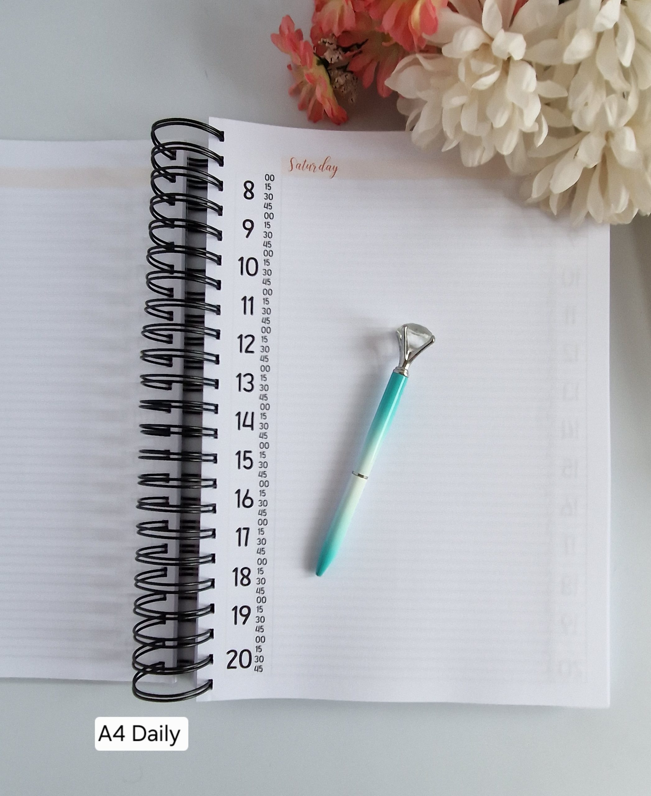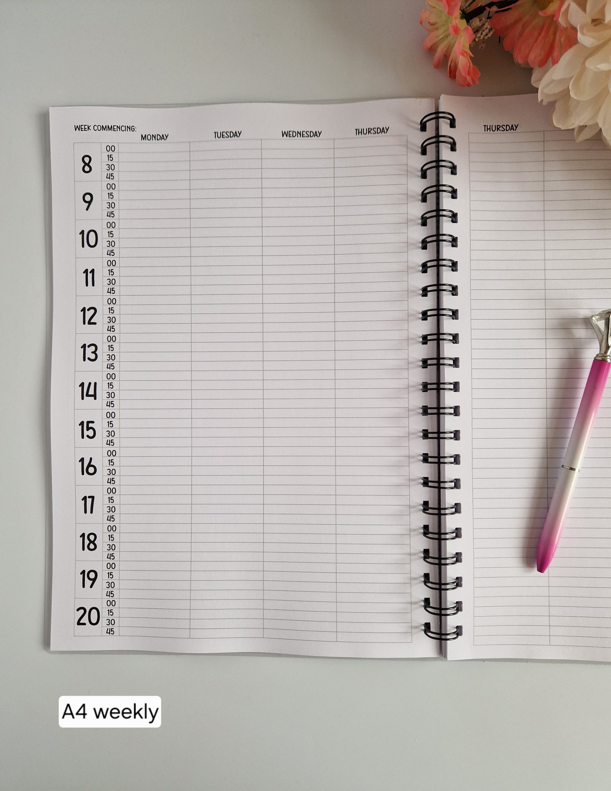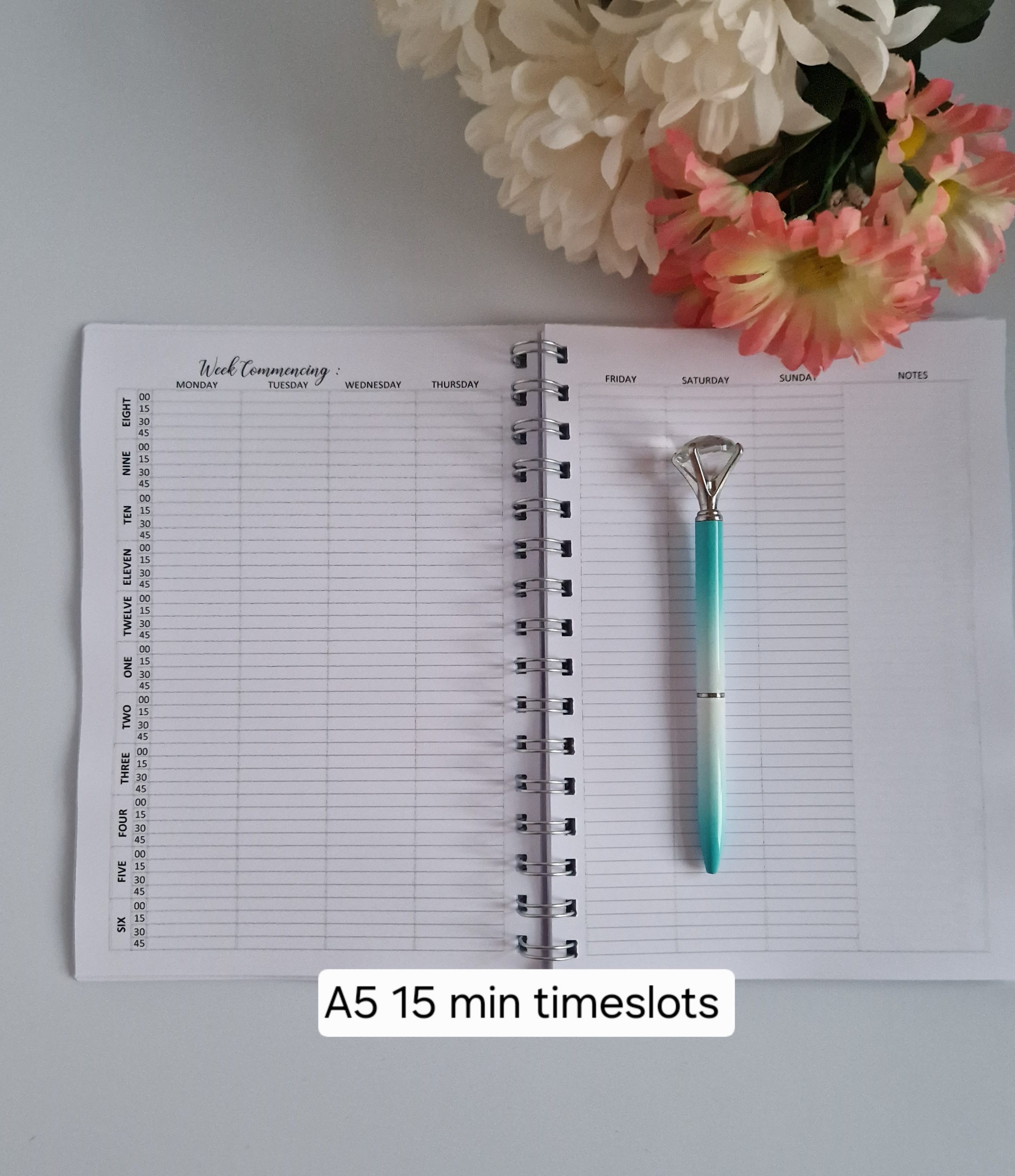 A4 Books- Mon-Sun -15 mins time slots from 8am- 9pm (on daily books Sat/Sun are on one split page). Cover is 250 card in 250 micron pouch laminates.