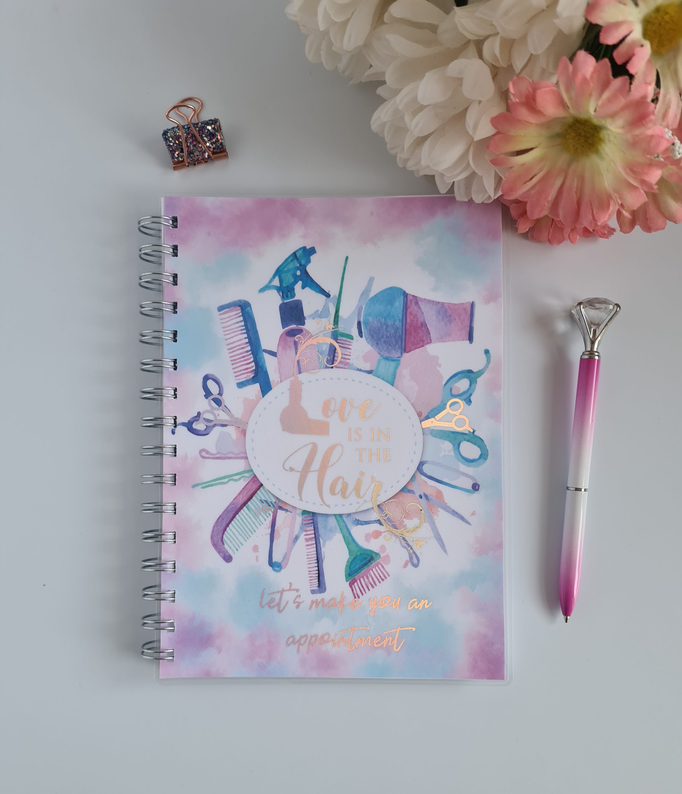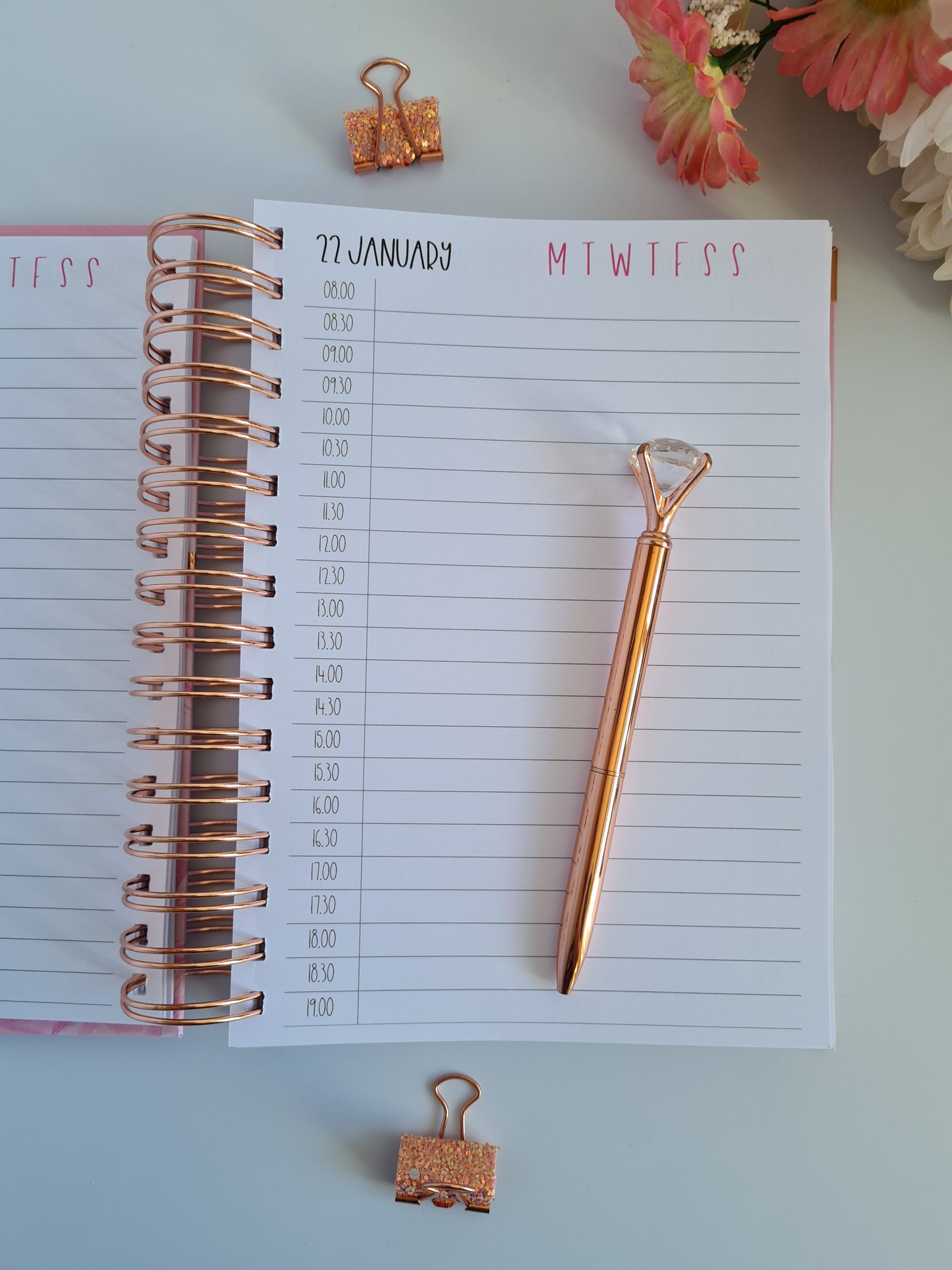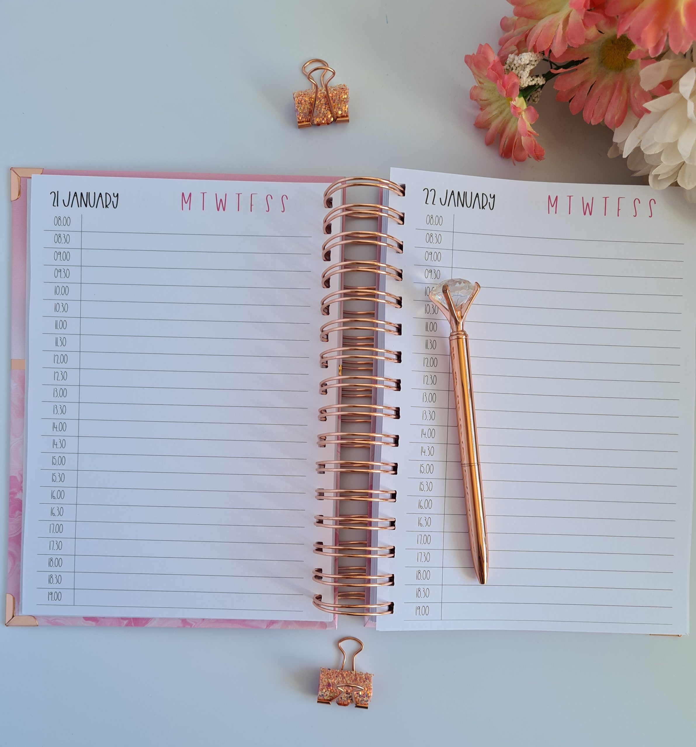 A5 Hardback book with daily pages. 30 min timeslots run from 08.00 – 19.00 – Dated books run 1st Jan- 31st Dec, but can be rearranged – you must contact me to let me know if you want it in it a different order. **Binding wires and corner protector colour may vary depending on stock.**