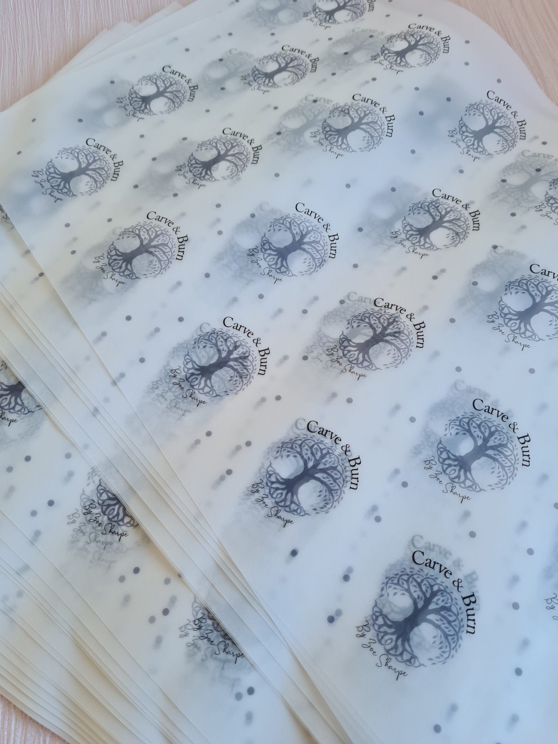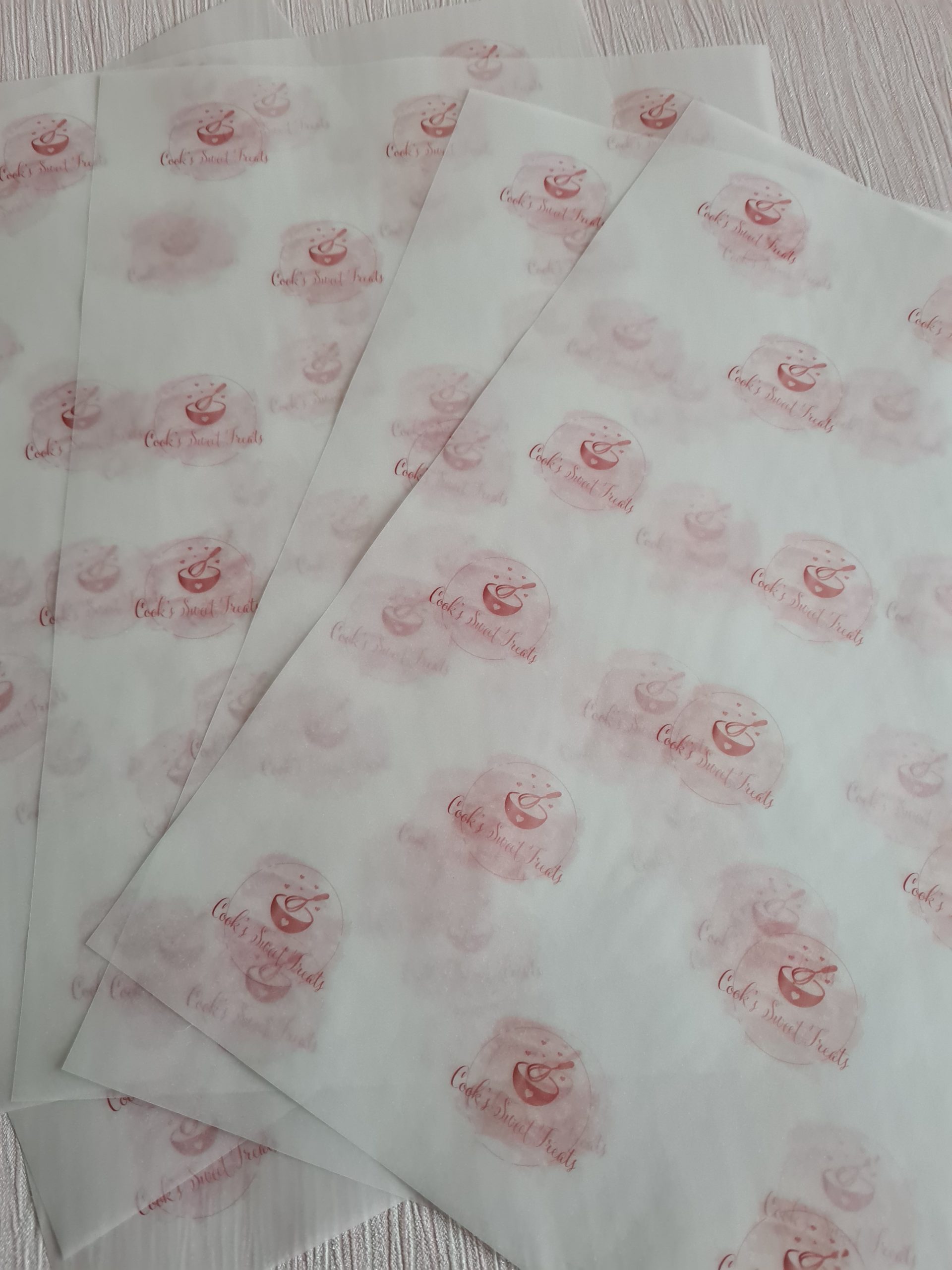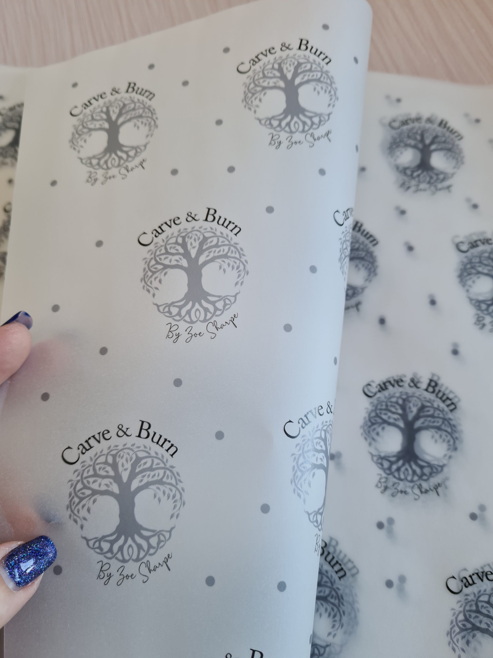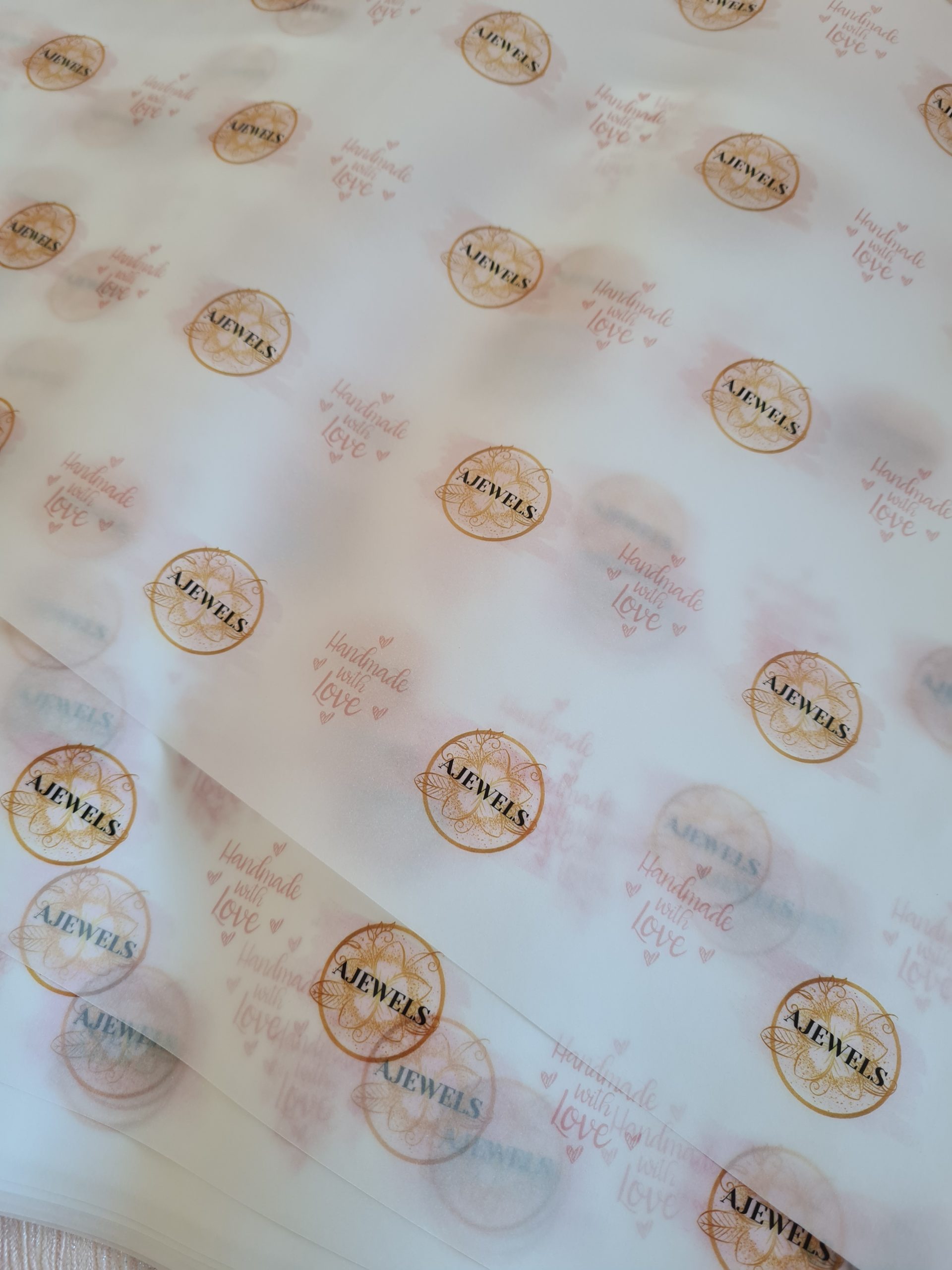 Translucent Vellum sheets personalised with your logo or business name. Printed using LED laser technology so ink/images will not smudge/smear or run if they get wet. ** the heat applied during the laser printing process can cause the vellum to have a slight wavy edge this does not effect the product once it is pulled tight for wrapping. Available in A4 size. There will be a border around the edge of the paper borderless/edge to edge printing is not available on this material. Sheets will be at least 62gsm but may vary up to 100gsm depending on availability of stock.