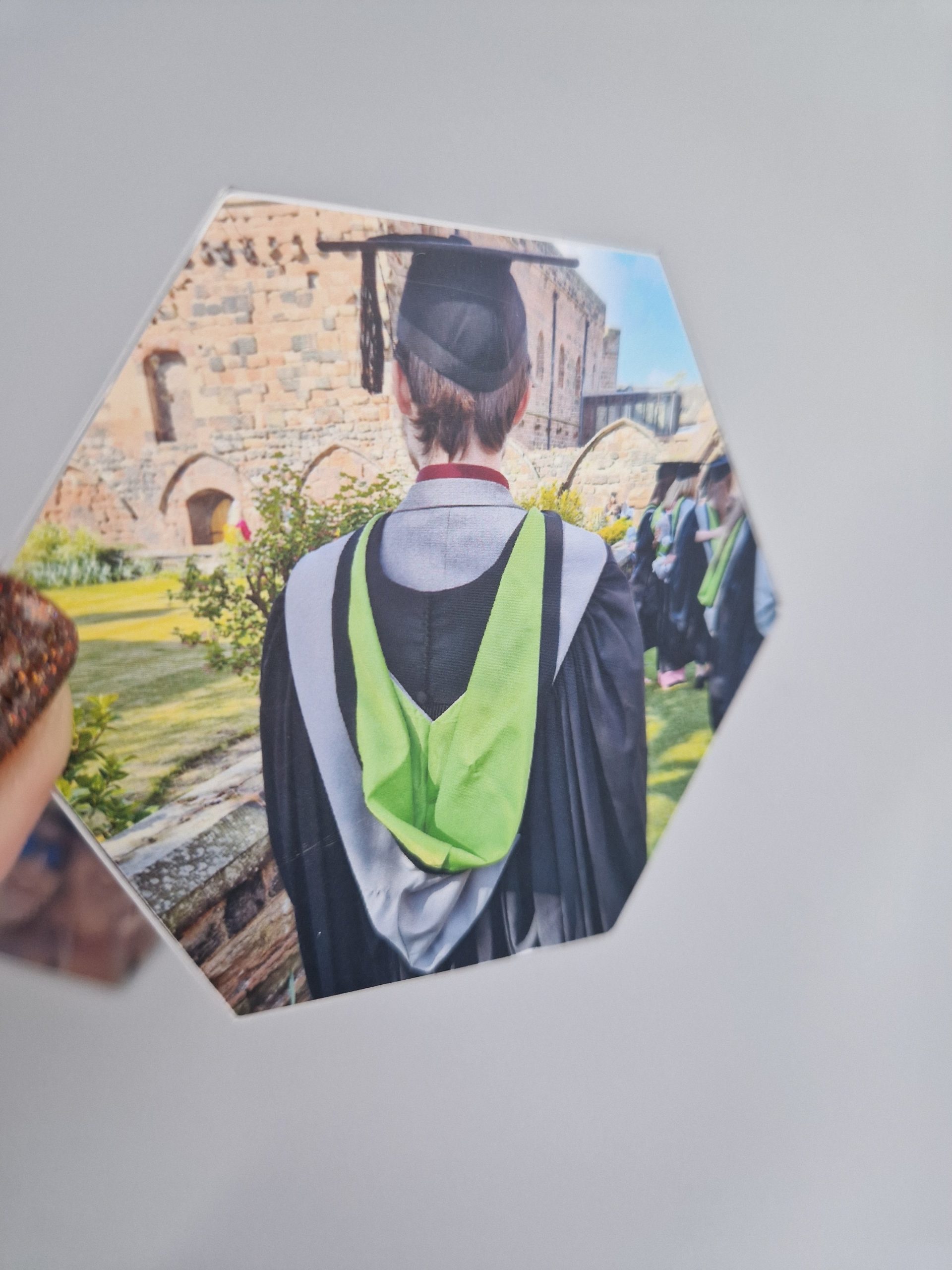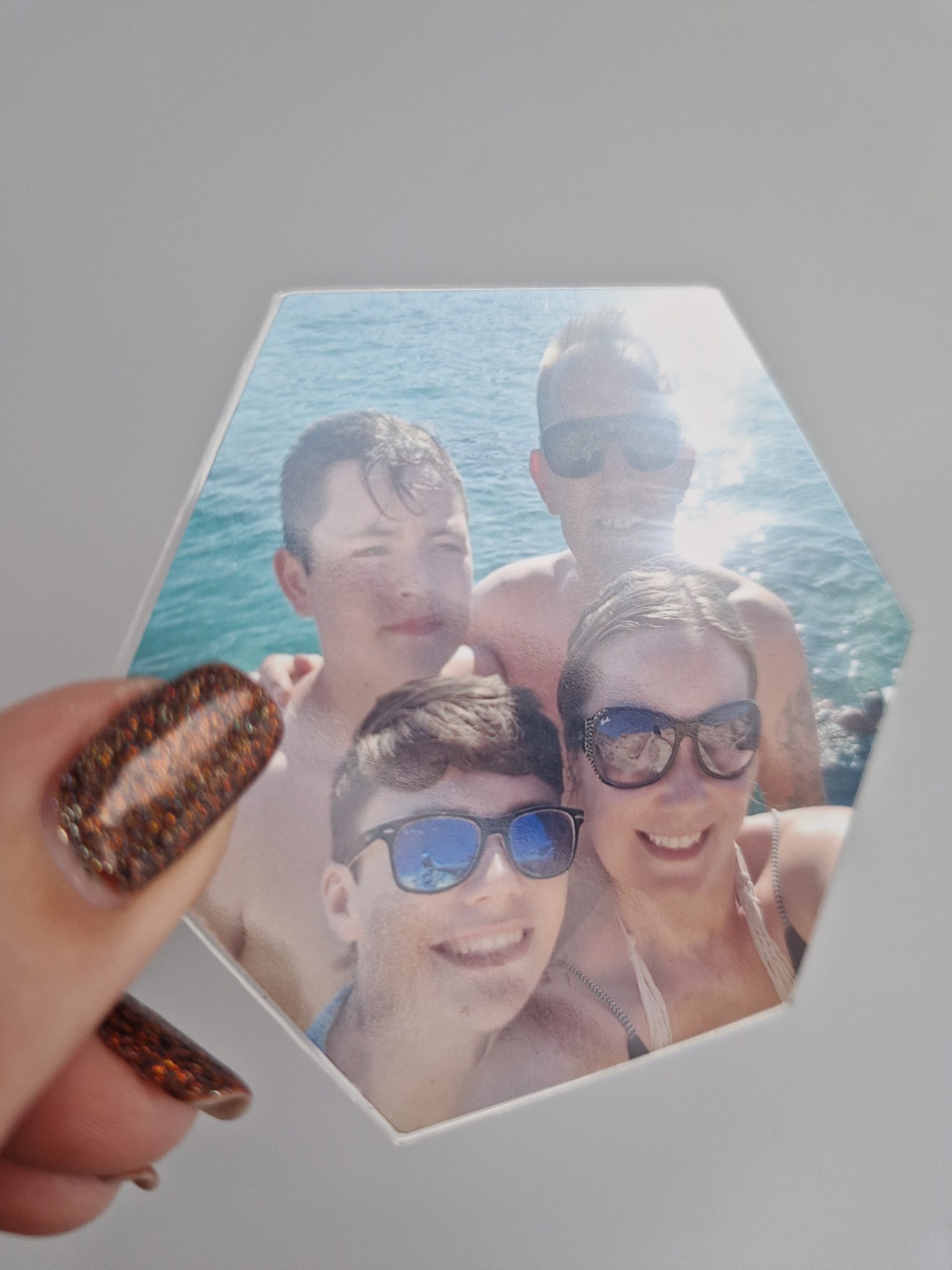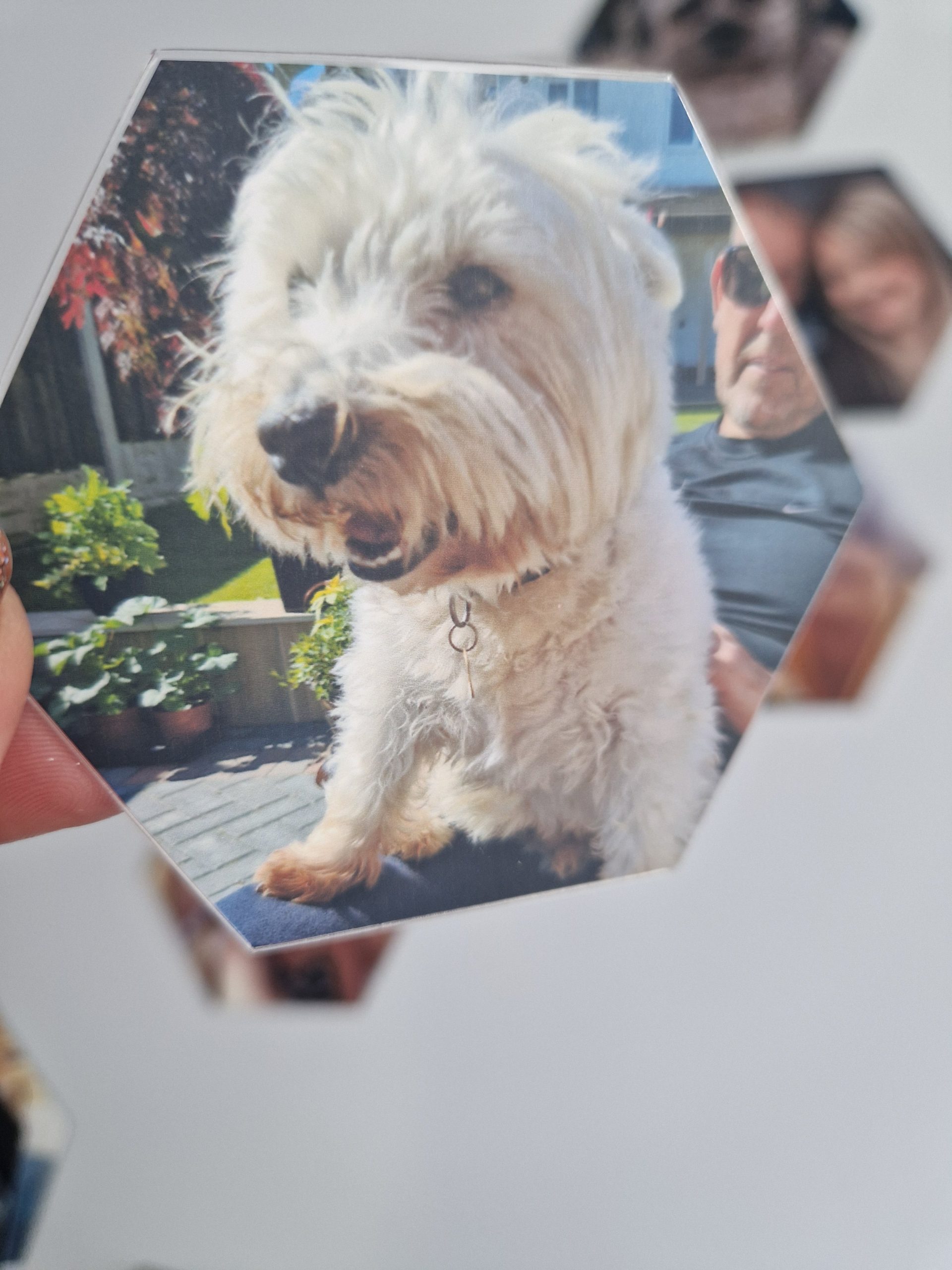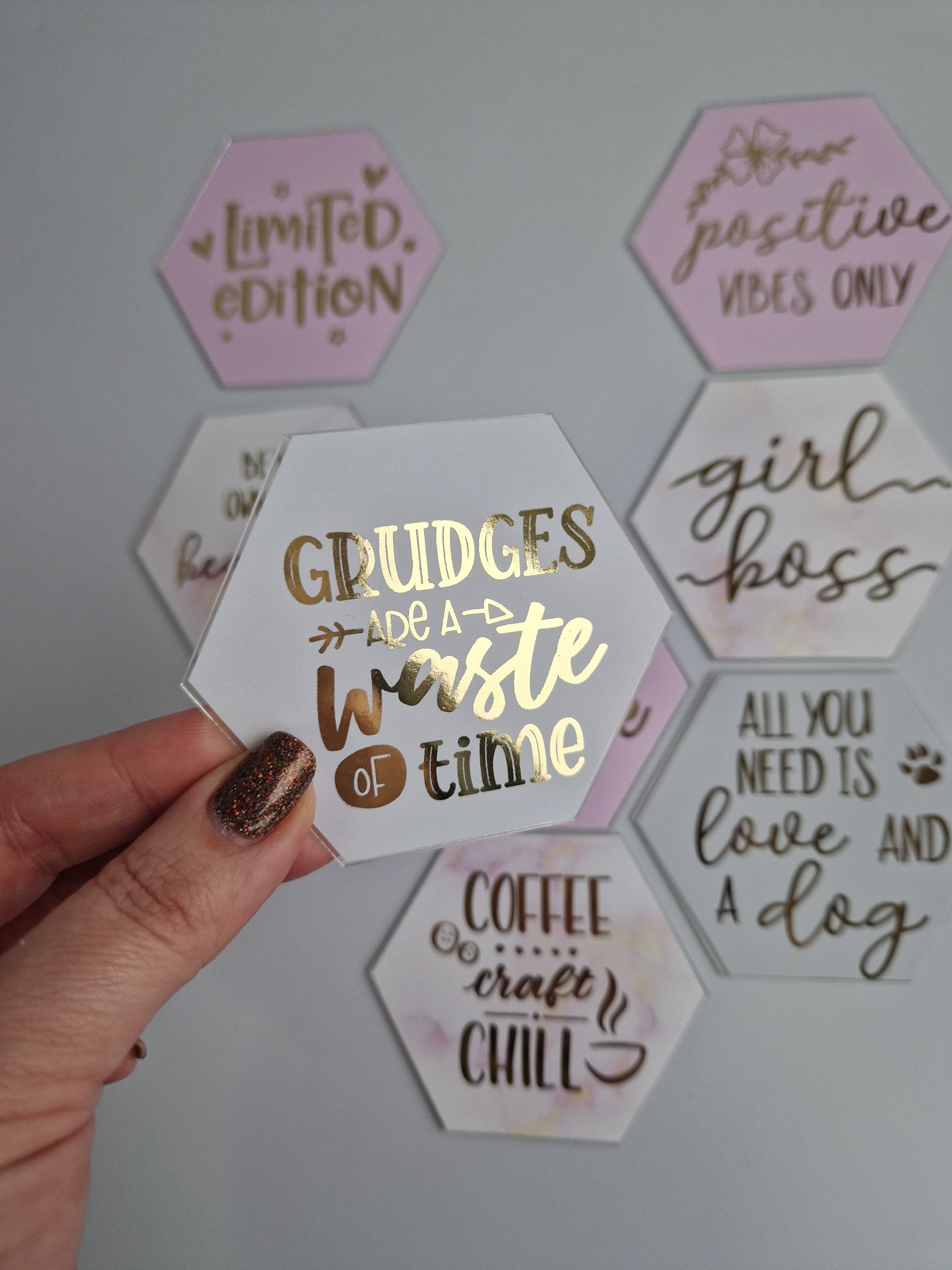 Hexagons are made from clear acrylic 1mm thick and are approx 8cm wide by 7cm high. Available in gloss, matte or foil finish.