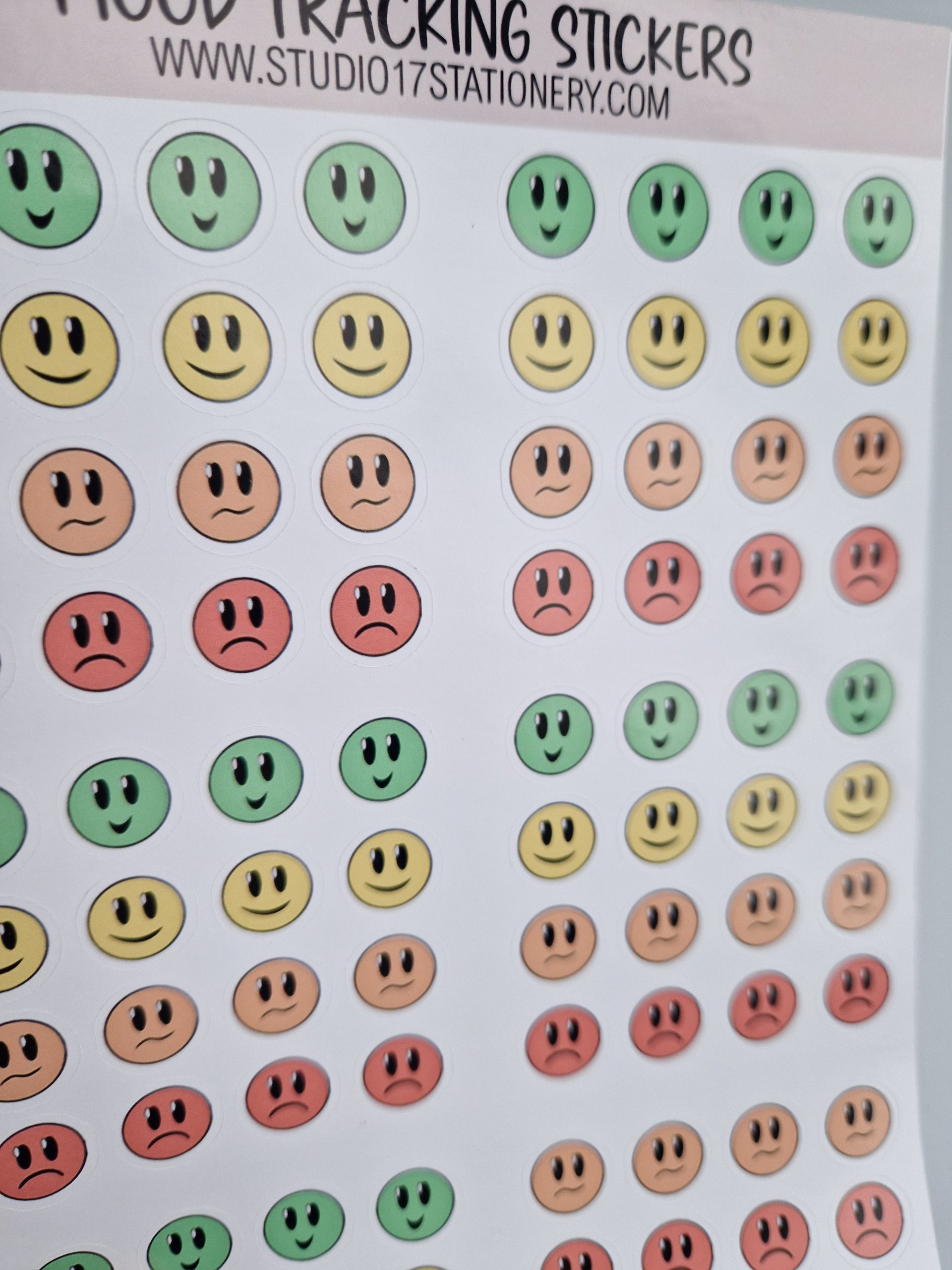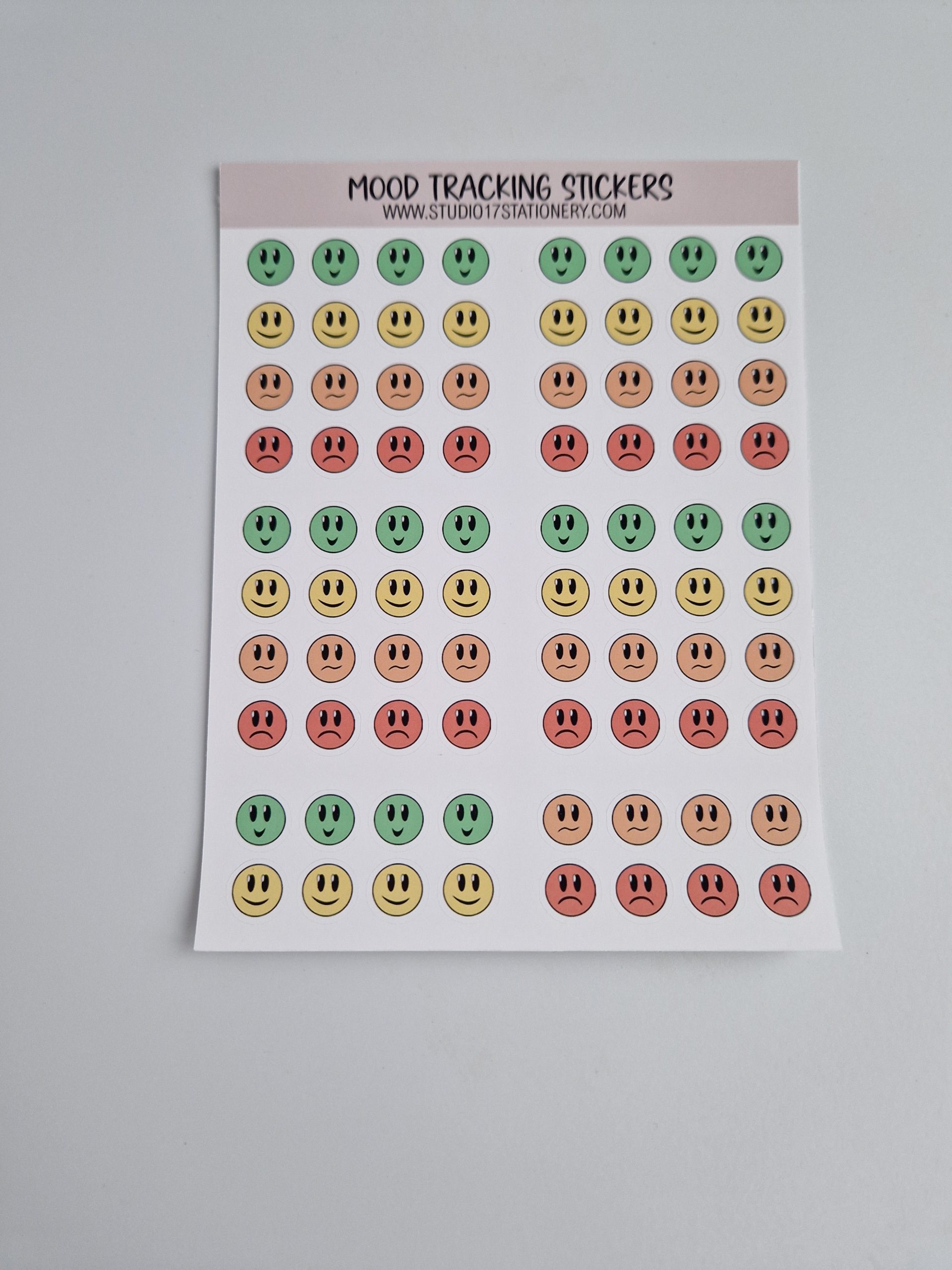 Sheet of kiss cut planner stickers with a mood tracking icon design. This sheet contains a total of 80 stickers.