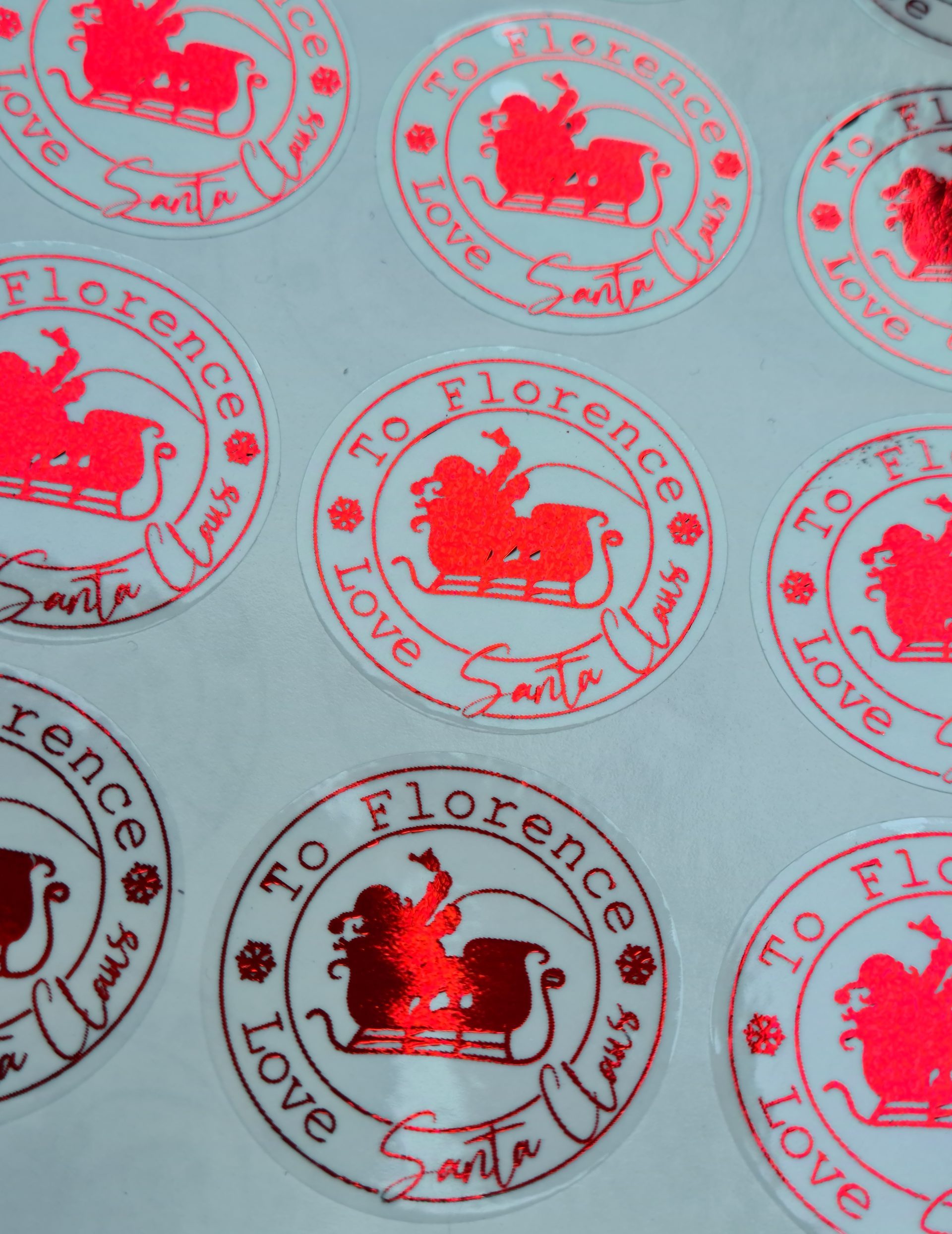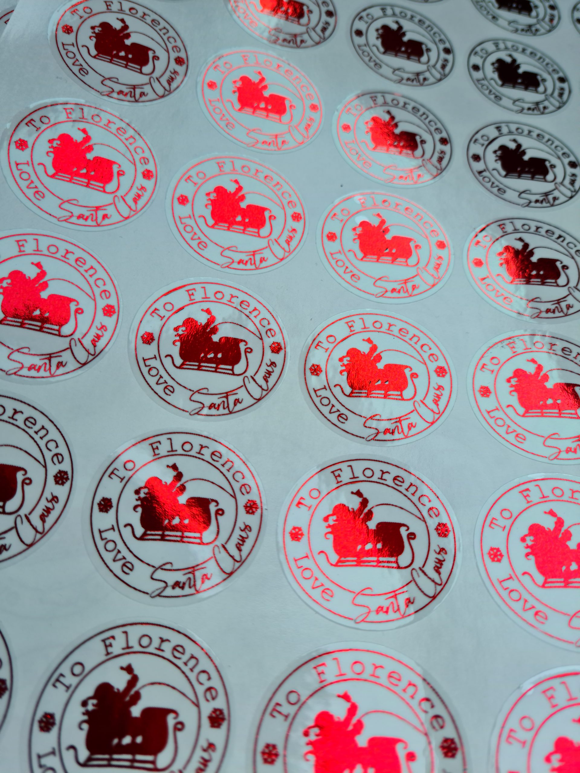 Funky stickers perfect for sealing christmas card envelopes or putting on parcels. 37mm round stickers with a personalised santa sleigh design.