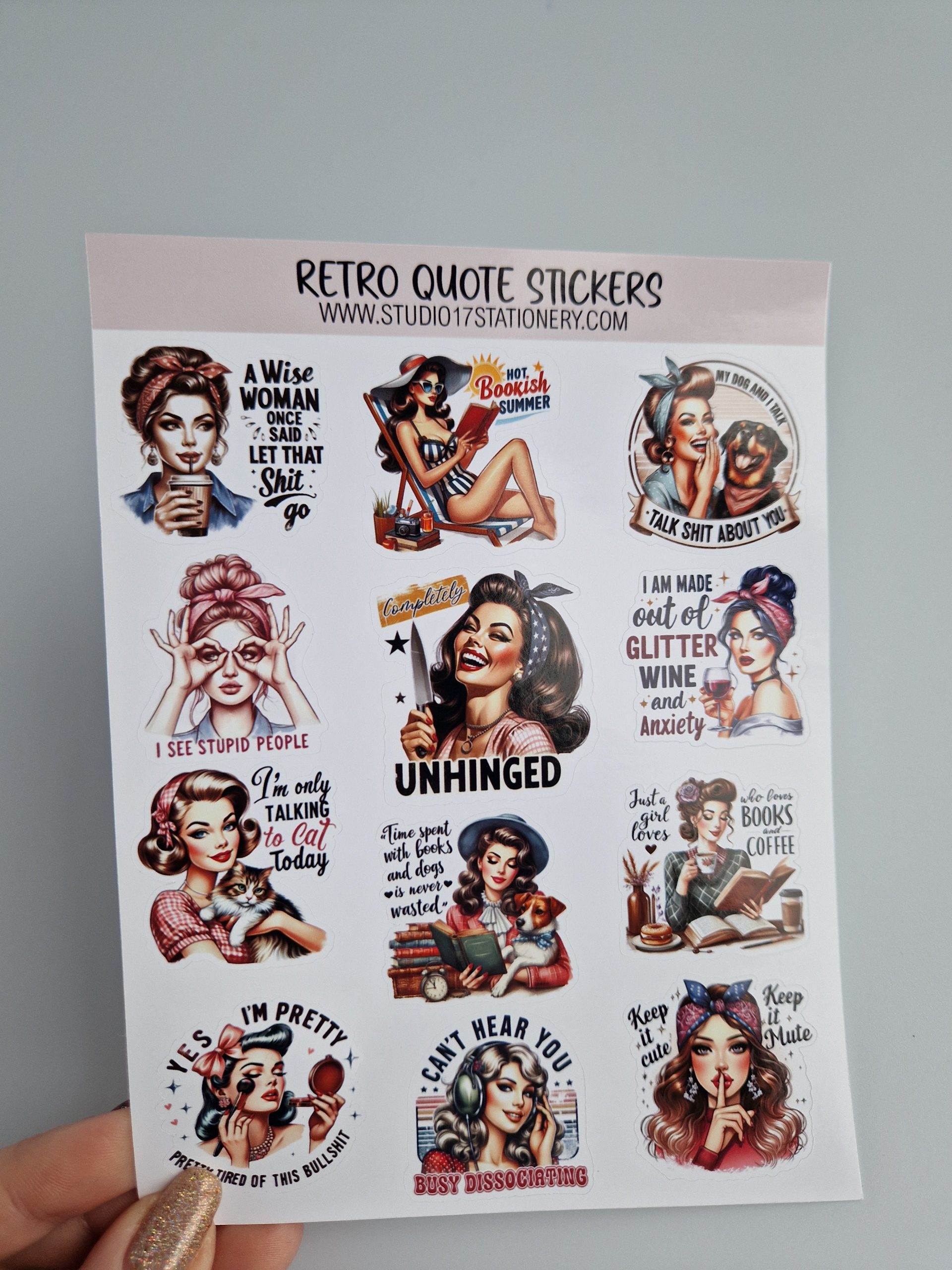 Sheet of kiss cut planner stickers with a retro quote design. This sheet contains a total of 12 stickers.