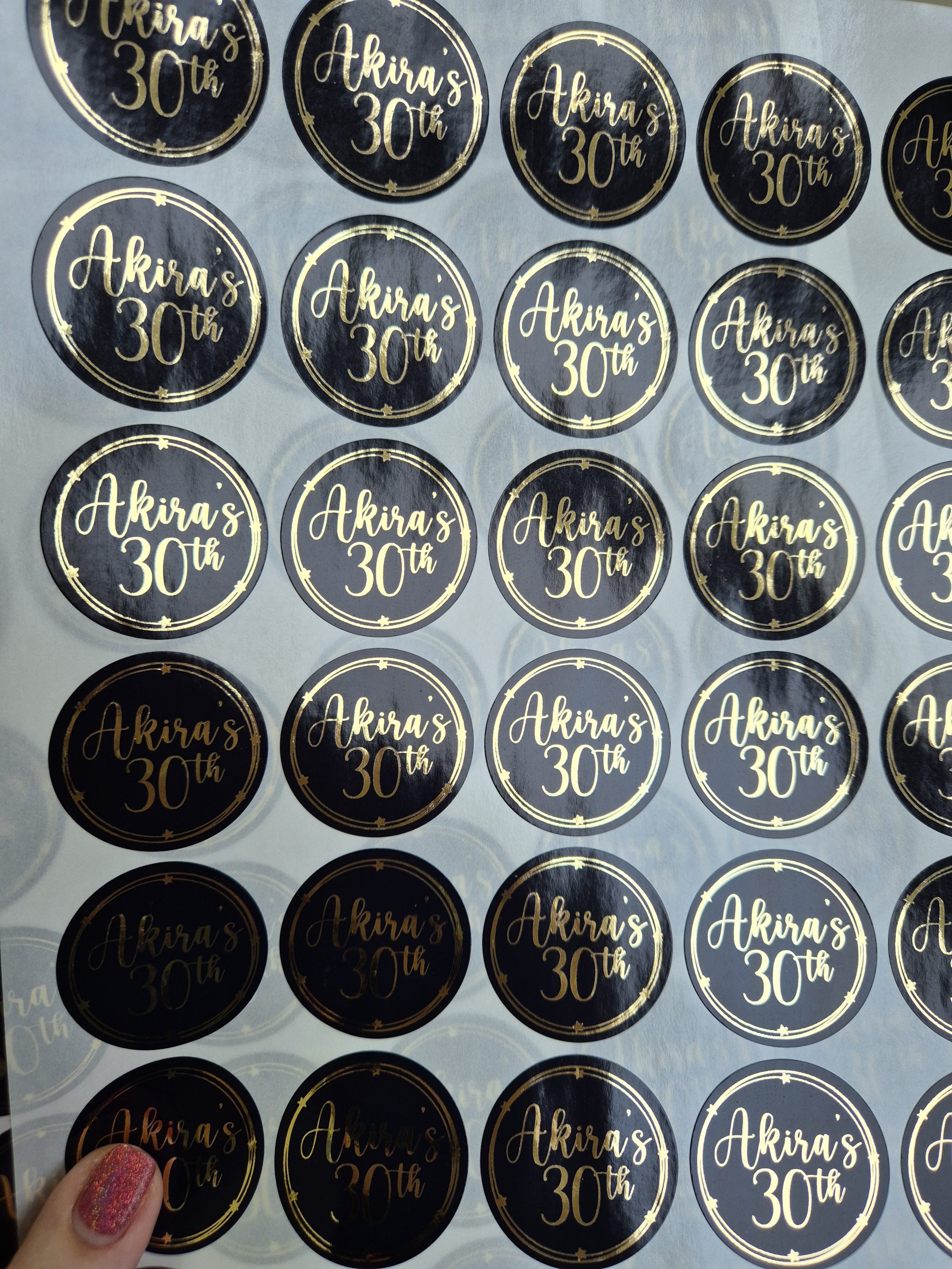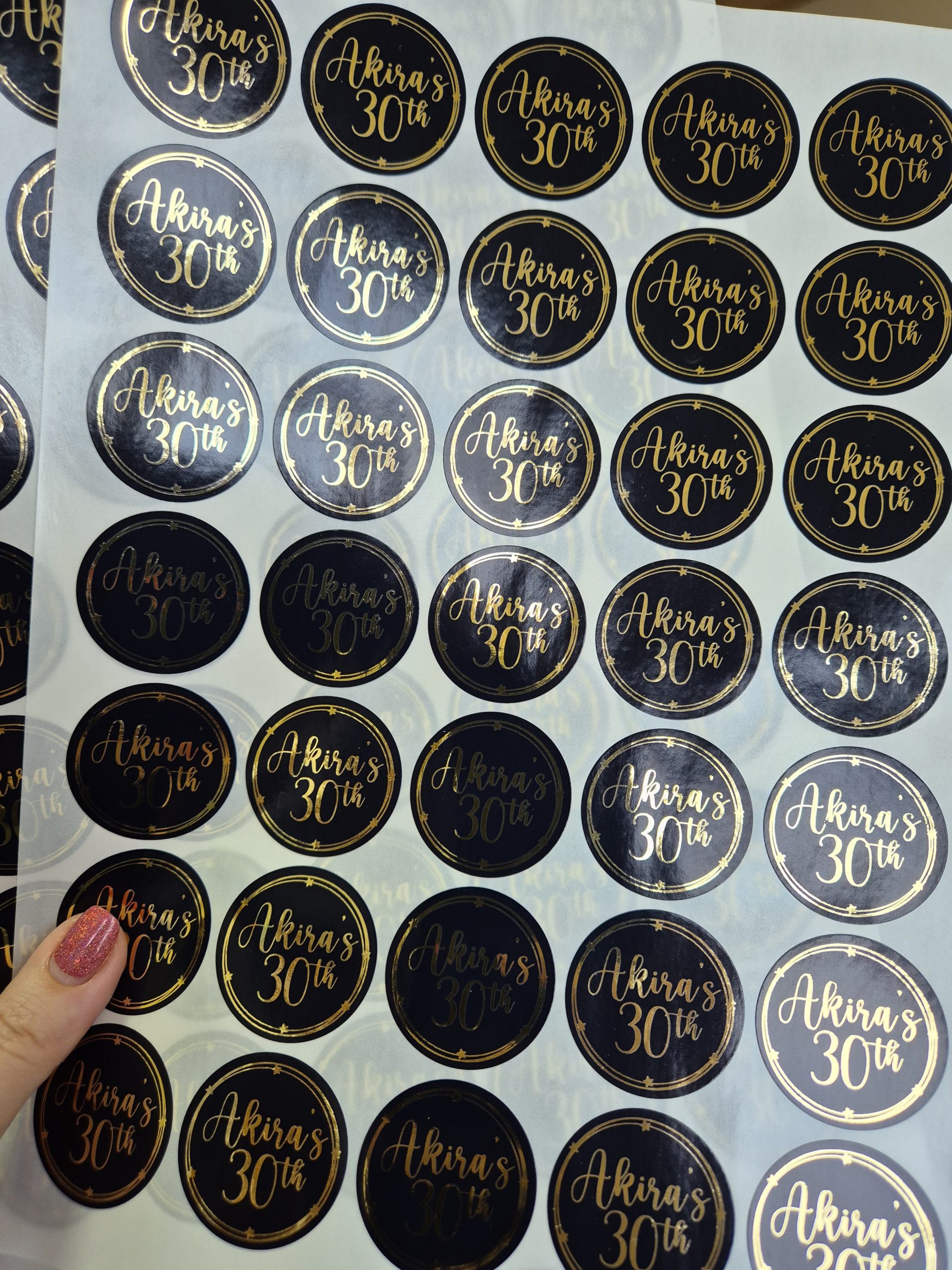 Foiled round stickers 37 mm. Available in White/Clear and Coloured Gloss or Frosted finish. Available in mulitples of 35.