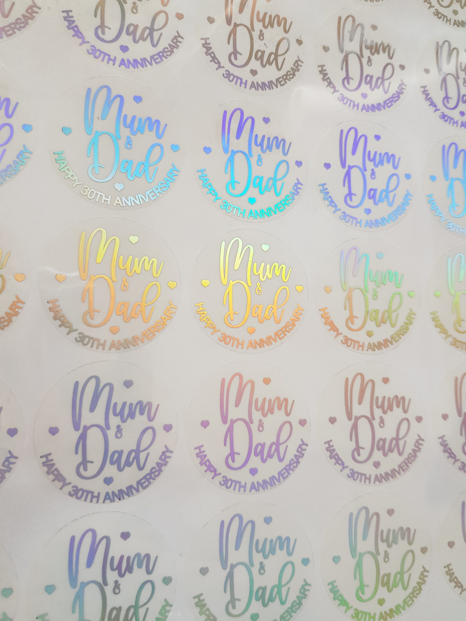 Foiled round stickers 37 mm. Available in White/Clear and Coloured Gloss or Frosted finish. Available in mulitples of 35.