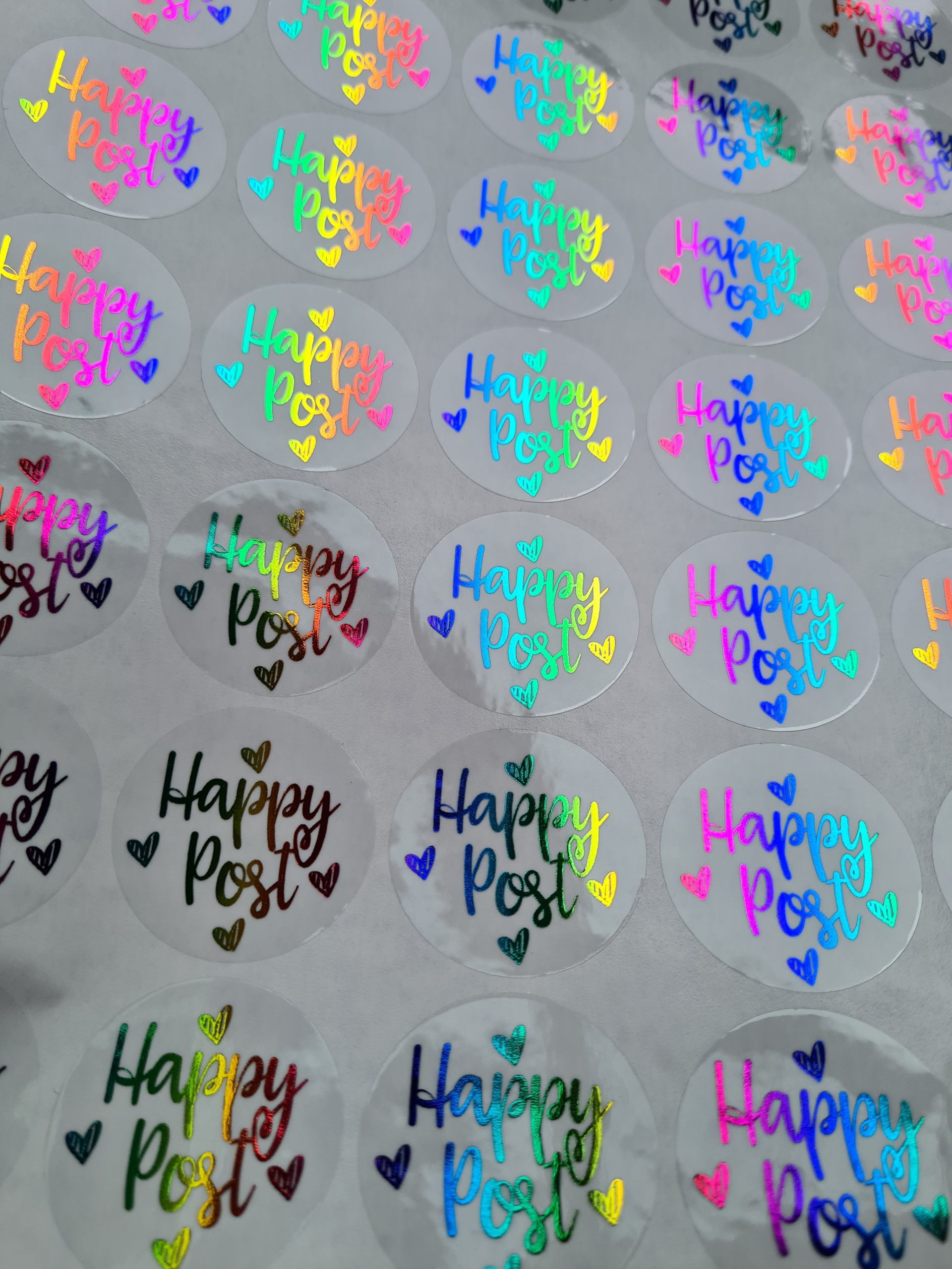 Foiled round stickers 37 mm. Available in White/Clear and Coloured Gloss or Frosted finish. Available in mulitples of 35.