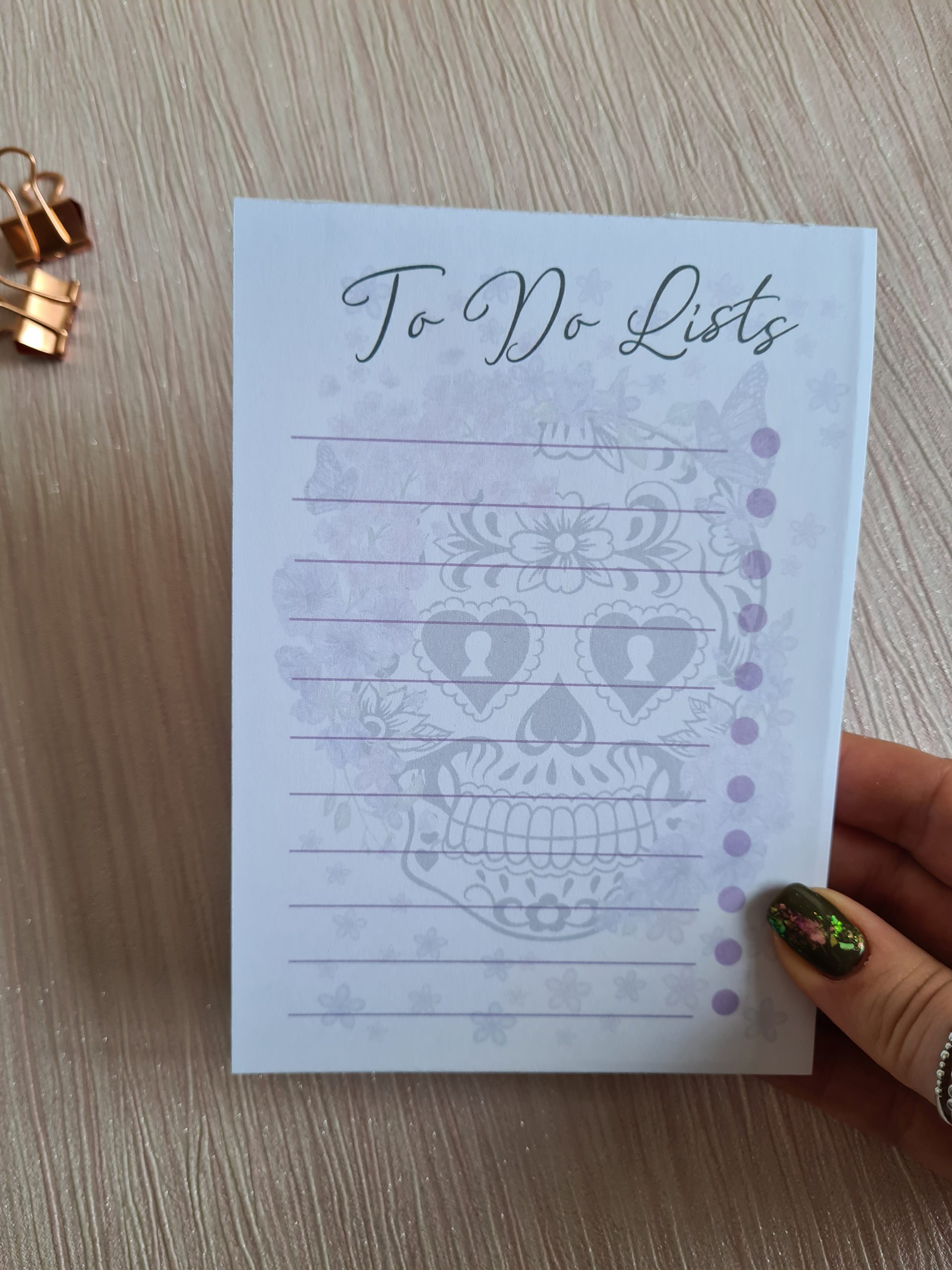 Cute and funky floral sugar skull theme for this to-do list pad with 50 tear off pages of 100gsm paper, a sturdy greyboard backing and gummed top edge.