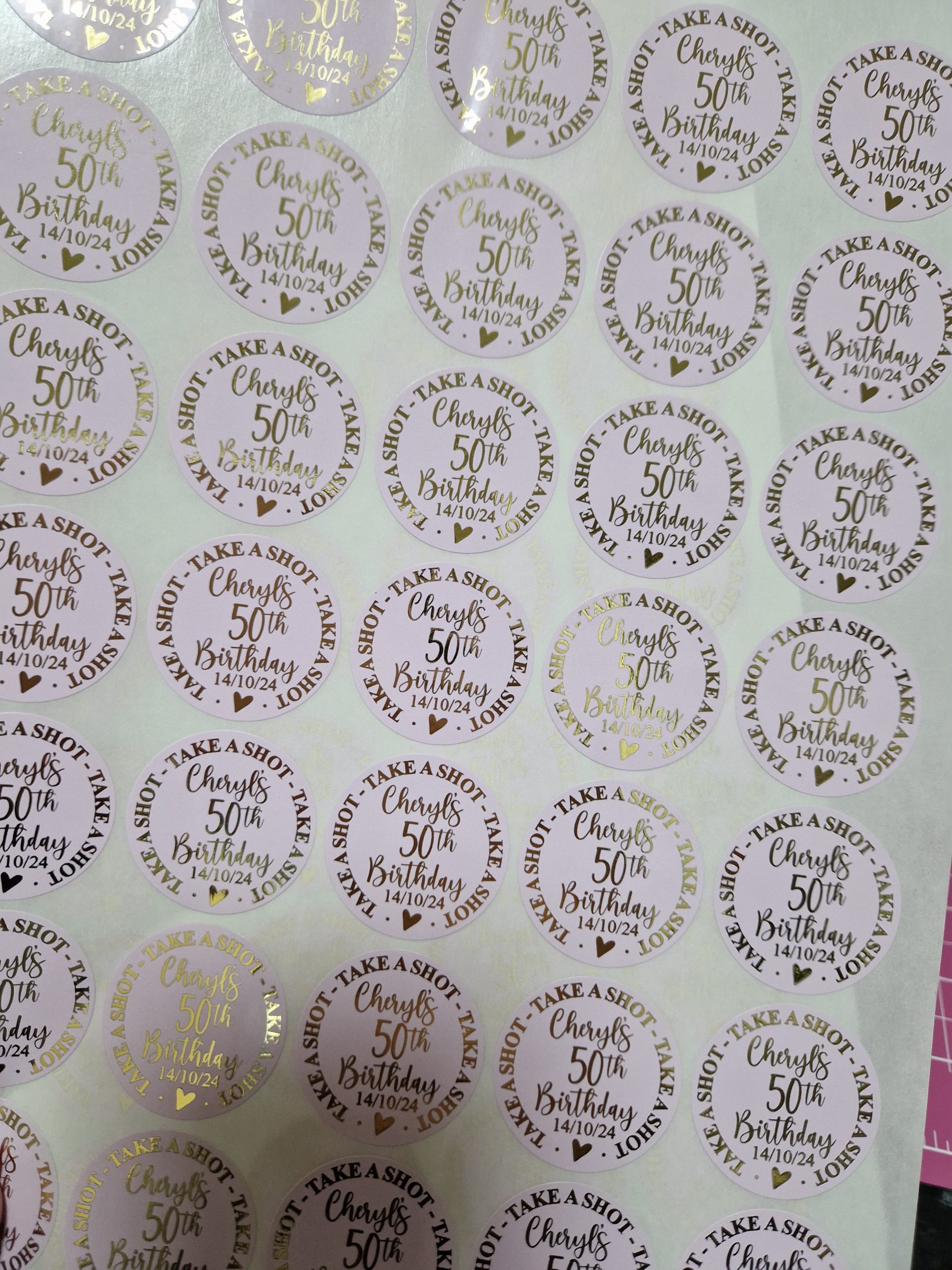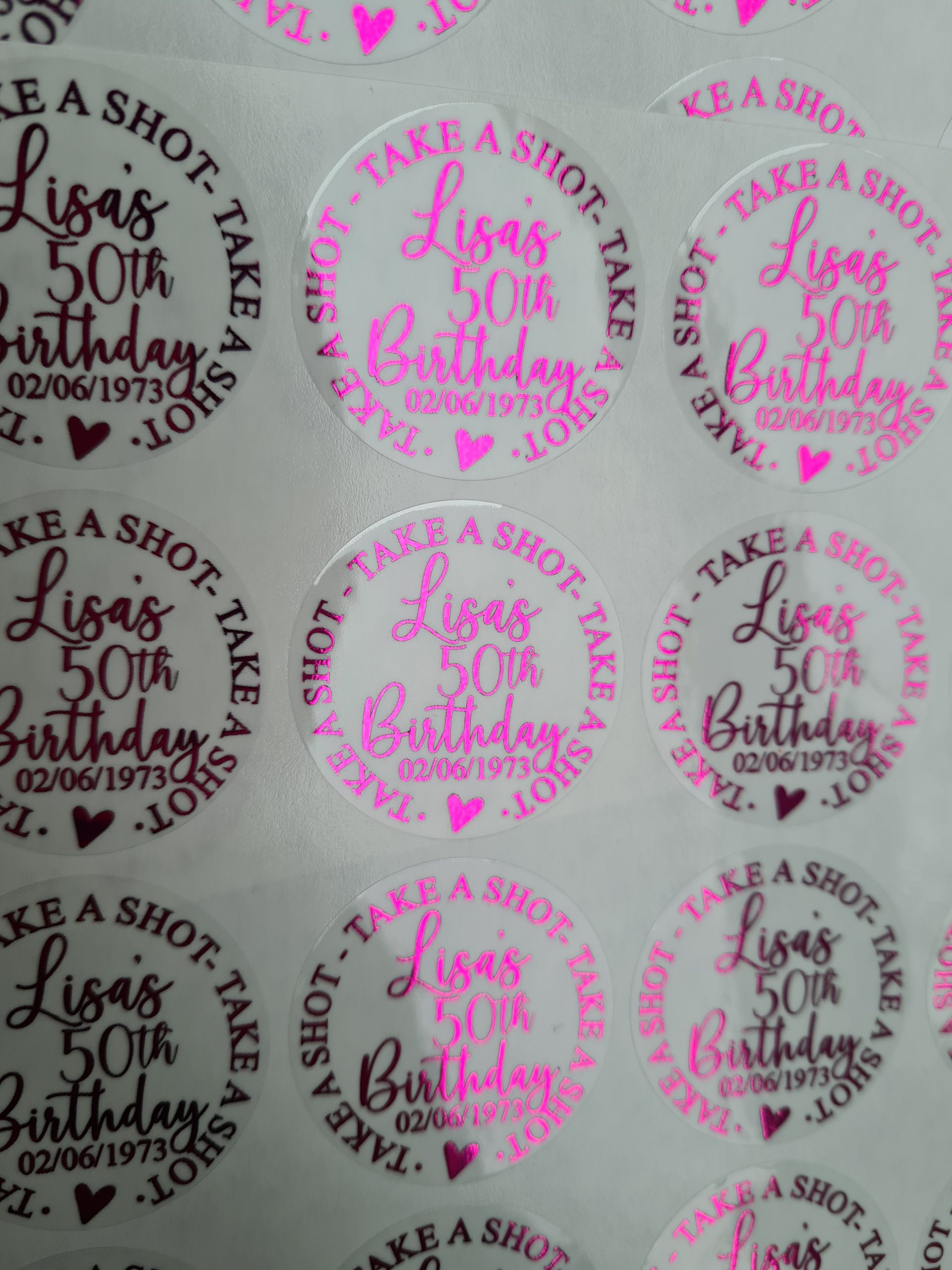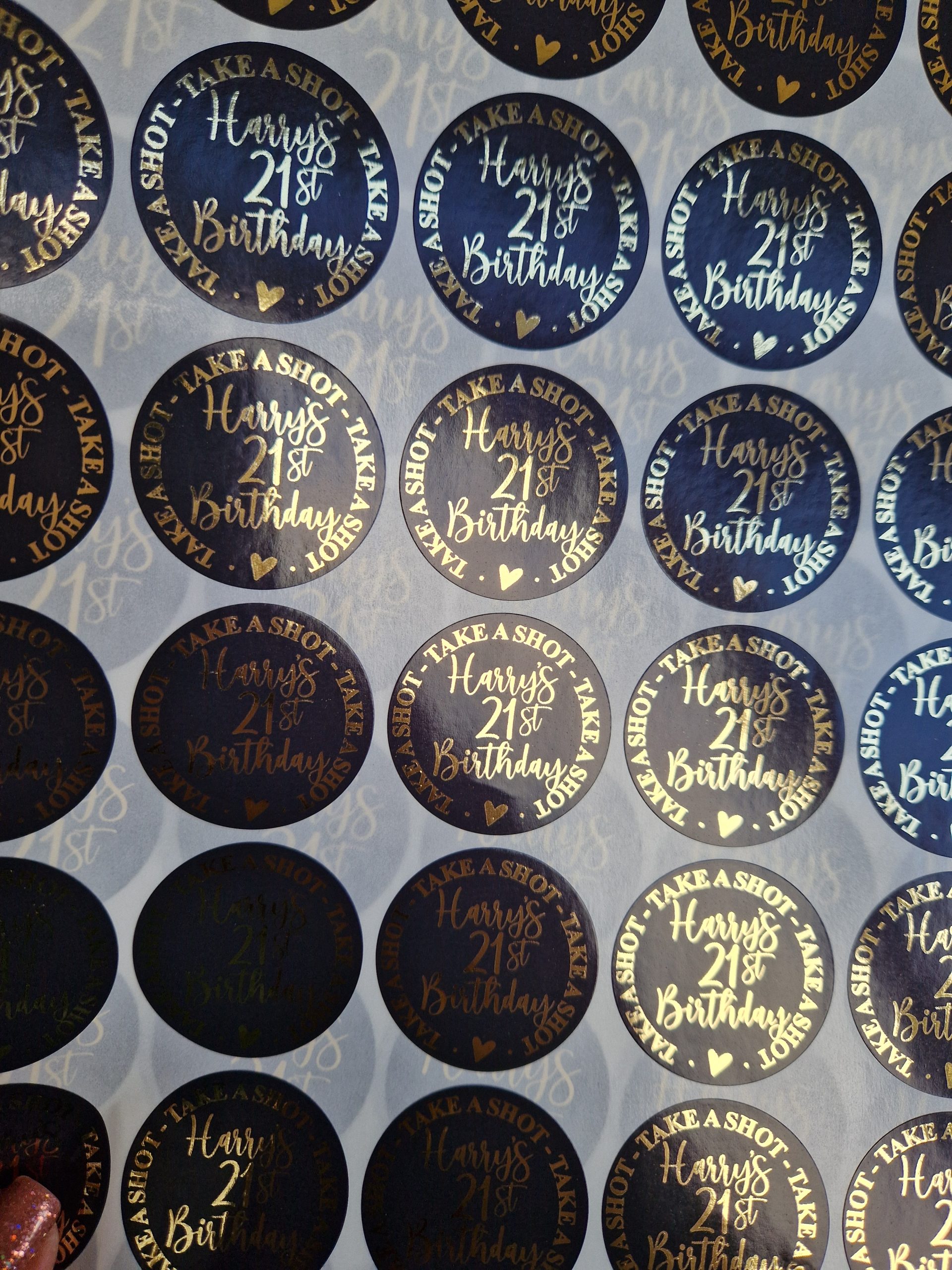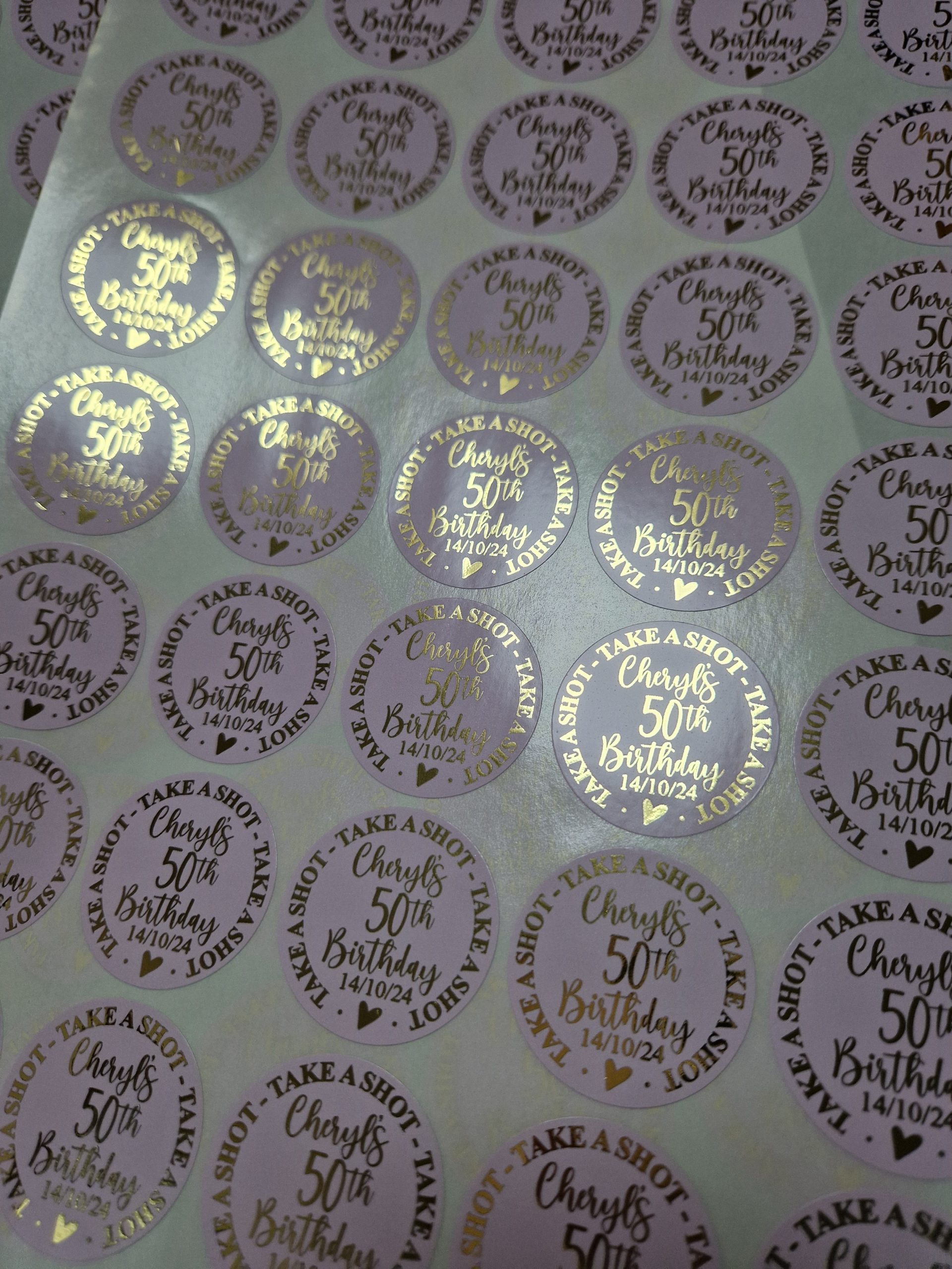Foiled round stickers 37 mm. Available in White/Clear and Coloured Gloss or Frosted finish. Available in mulitples of 35.
