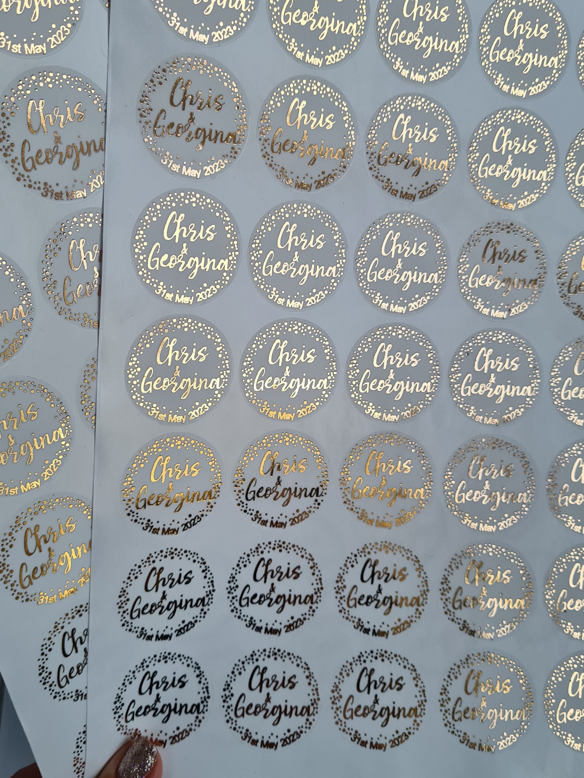Round foiled stickers – 37 mm. Available in White/Clear and Coloured Gloss or Frosted finish. Available in multiples of 35. Price will change based on your selections,