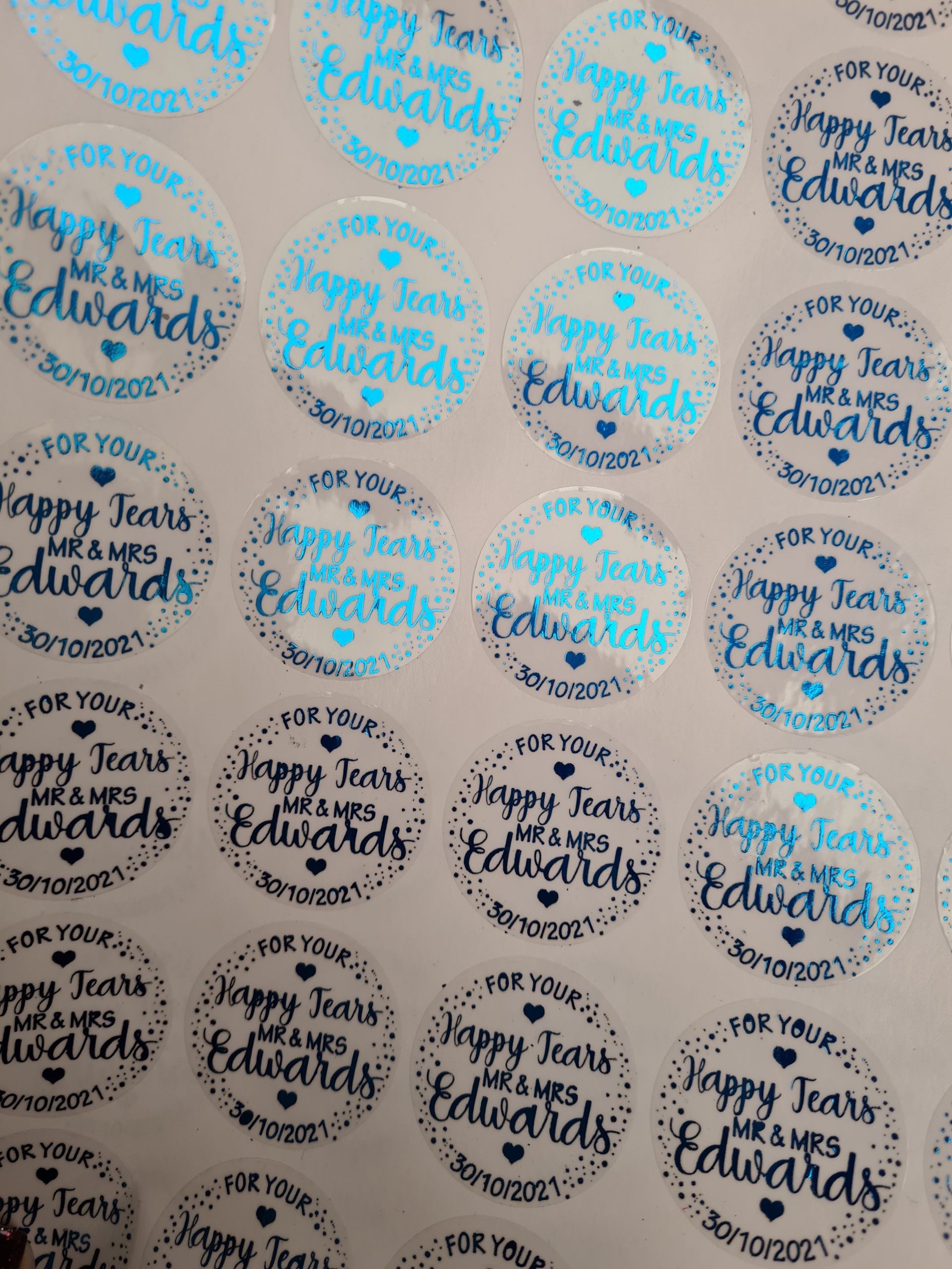 Round foiled stickers – 37 mm. Available in White/Clear and Coloured Gloss or Frosted finish. Available in multiples of 35. Price will change based on your selections,