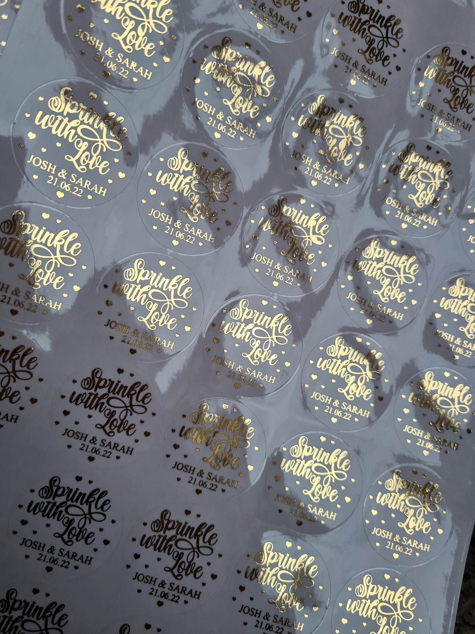 Foiled wedding stickers 37 mm. Available in White/Clear and Coloured Gloss or Frosted finish. Available in mulitples of 35.