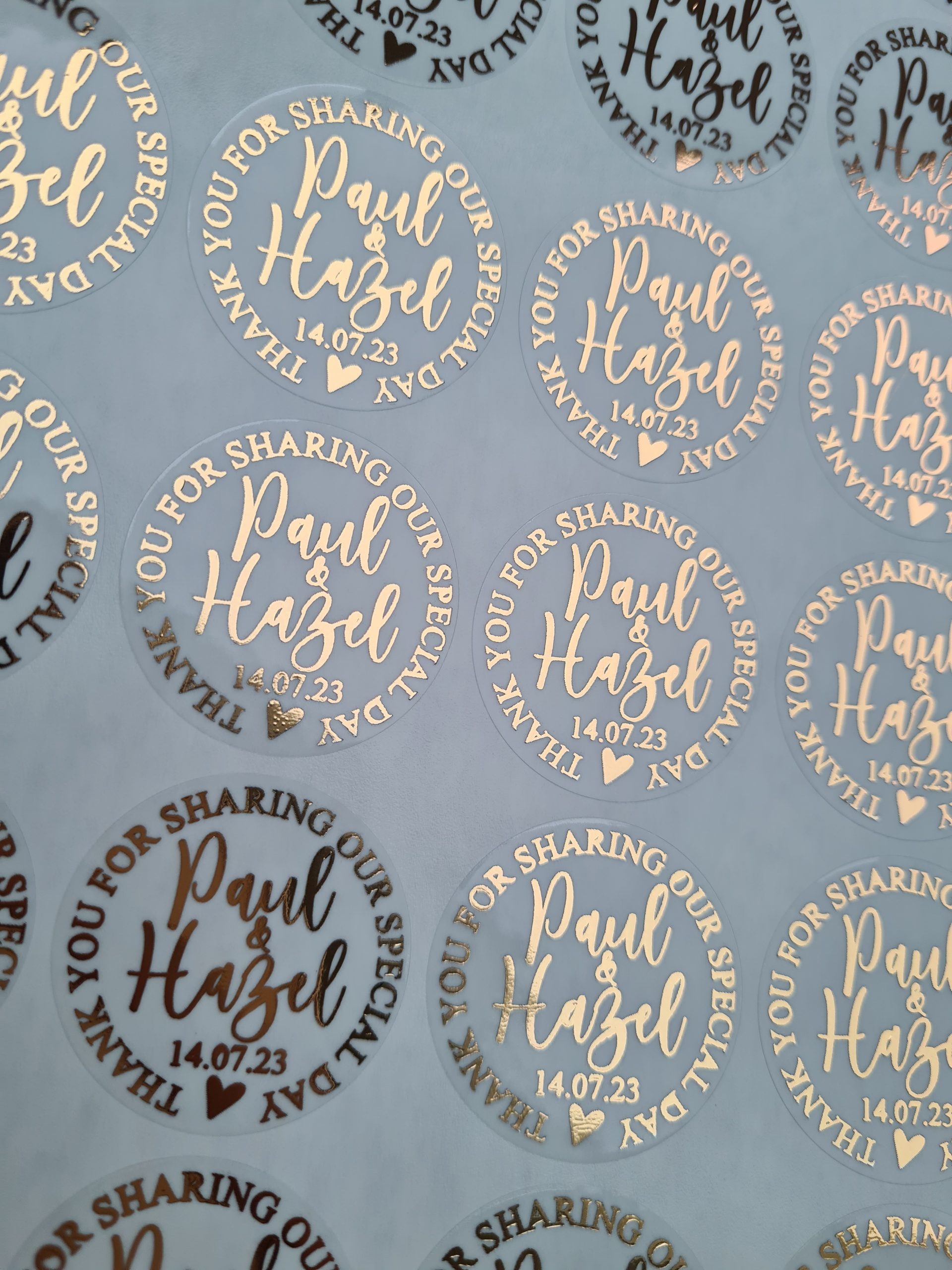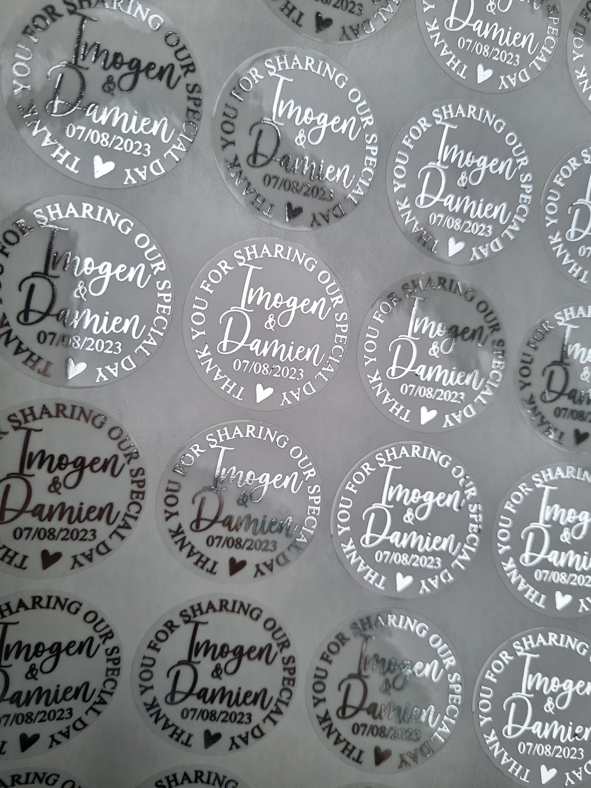 Round foiled stickers – 37 mm. Available in White/Clear and Coloured Gloss or Frosted finish. Available in multiples of 35. Price will change based on your selections,